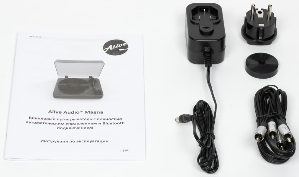 В комплект поставки помимо самого проигрывателя входят инструкция на русском языке, аудиокабель 2×RCA, блок питания со съемной вилкой и адаптер для синглов-«сорокапяток».