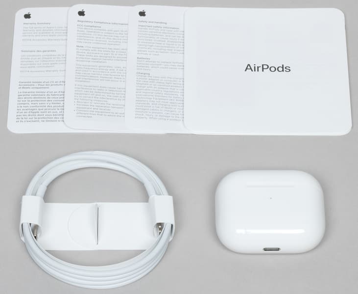 Единственное отличие комплектации третьего поколения AirPods от второго — на другом конце кабеля Lightning штекер USB-C, а не USB-A. Так же было и у AirPods Pro. И для пользователей ноутбуков и топовых планшетов Apple это плюс, для остальных же, скорее, минус. Все-таки зарядки с USB-разъемом по-прежнему встречаются чаще.