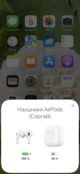 Первоначальное соединение с iOS-устройствами у AirPods происходит точно так же, как у предыдущих поколений: открываем футляр — на iPhone сразу возникает окно с предложением соединить наушники. Подтверждаем, вставляем наушники в уши — и готово. После при открытии футляра нам будут показывать уровень заряда и его, и наушников.