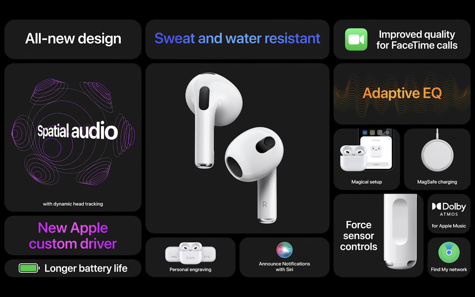 Для начала напомним основные аспекты новинки, на которые мы обратили внимание в репортаже с презентации AirPods 3. Здесь заявлена поддержка беспроводной зарядки MagSafe и технологии пространственного звучания Dolby Atmos, также сообщается о наличии адаптивного эквалайзера, подстраивающего частоты в зависимости от внешнего окружения. Устройство, как и AirPods Pro, работает на чипе Apple H1, а управляется в том числе нажатием на сенсорную зону, расположенную на ножке.