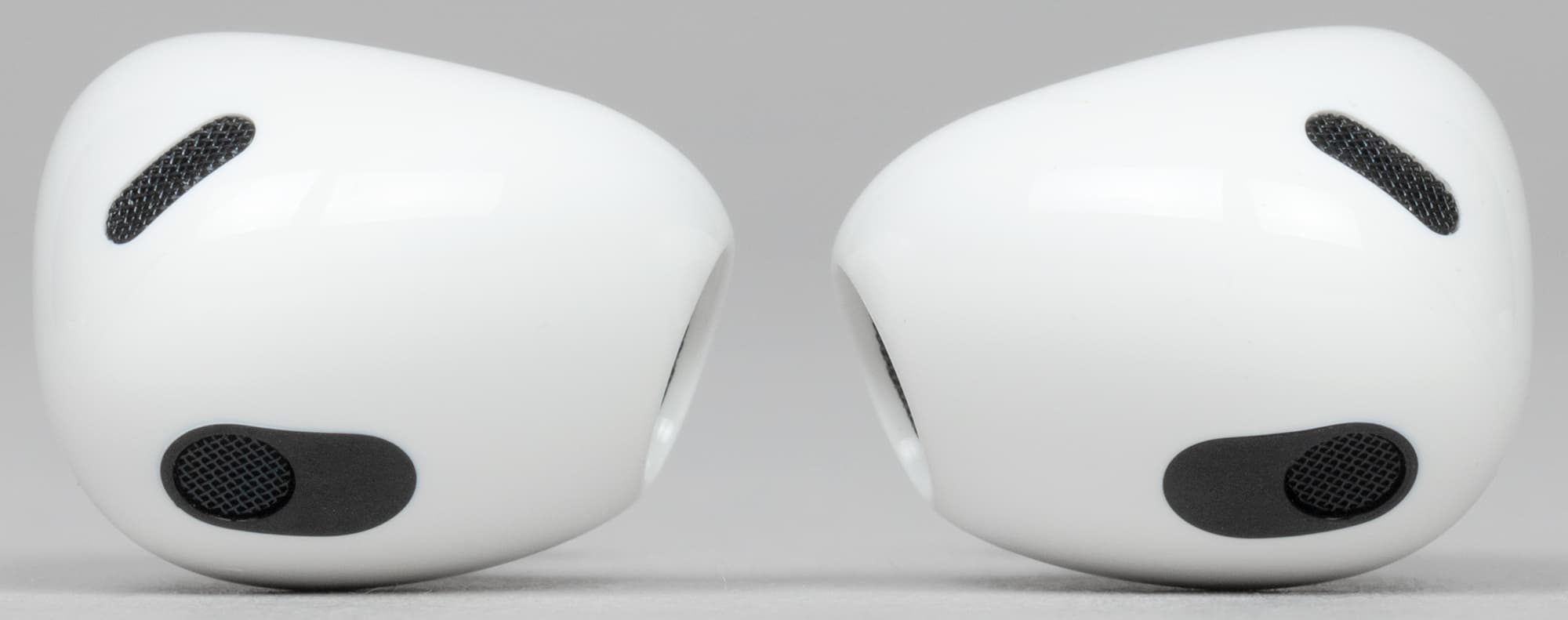 Пара других деталей: наружные микрофоны для общения и команд Siri расположены у основания ножки и сверху «капелек», оба закрыты черной сеткой, защищающей от влаги и ветра (стандарт защиты IPX4 предполагает возможность использования AirPods 3 под дождем).