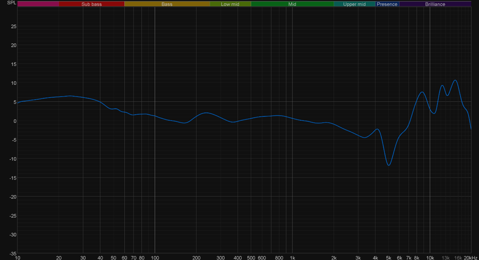 Все, о чем мы говорили выше, заметно и на графике: основательно форсированный «глубокий бас», ровная середина… К изрезанности графика в ВЧ-диапазоне мы традиционно не будем относиться слишком серьезно. График АЧХ показан на фоне кривой HEQ (headphone compensation for flat EQ target), предоставленной производителем используемого стенда. Задача кривой — помочь скомпенсировать резонансные явления в имитированном ухе и особенности оборудования, создав «звуковой профиль», максимально корректно иллюстрирующий то, как звучание наушников воспринимается слушателем. Ее можно рассматривать как адаптированный под конкретное устройство аналог так называемой «кривой Хармана», созданной командой Harman International под руководством доктора Шона Олива. Скомпенсируем полученный график АЧХ в соответствии с кривой HEQ.