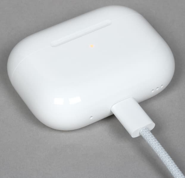 Зато поддерживаются беспроводная зарядка Qi и MagSafe. В момент старта зарядки динамик внутри кейса делает радостный «бздынь», а на передней панели загорается оранжевый индикатор. Использовать комплектный кабель совершенно не обязательно — в ходе тестирования мы неоднократно заряжали гарнитуру другими, оказавшимися под рукой.