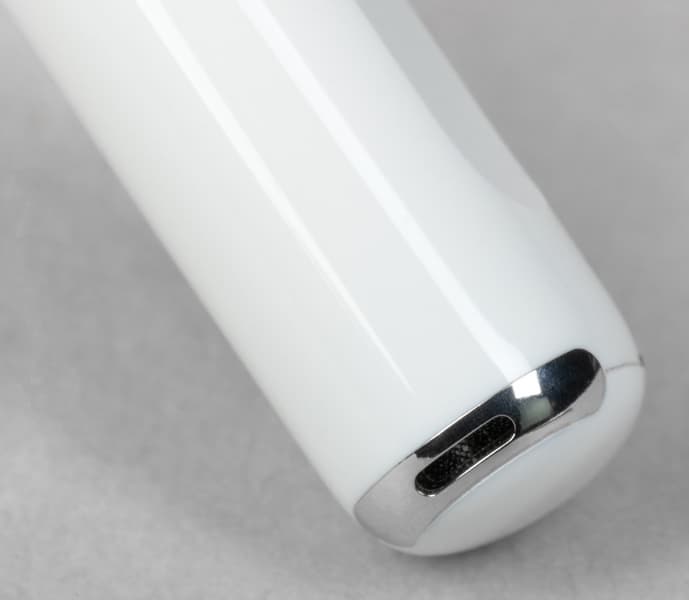 Наушники тоже выполнены из глянцевого белого пластика, на боковой поверхности «палочек» размещена сенсорная зона, подчеркнутая с помощью небольшого углубления — к ней мы еще вернемся.
