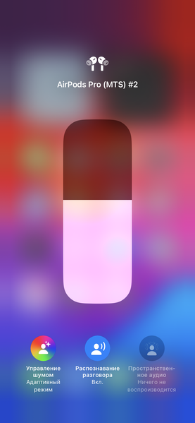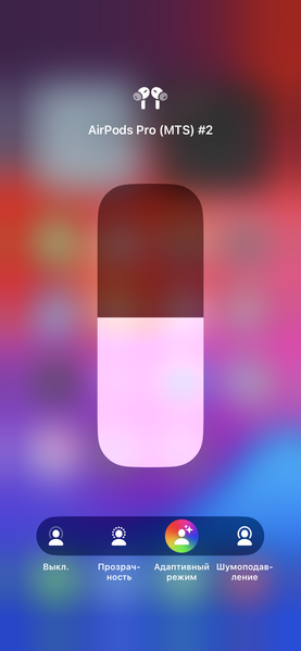 Как уже упоминалось выше, для работы AirPods Pro с устройствами Apple не требуется установки специального ПО, всё необходимое уже есть в iOS. При открытии крышки кейса появляется «всплывающее» окно, демонстрирующее уровень зарядки футляра и наушников. Все основные действия с гарнитурой можно осуществлять через модуль, вызываемый из «шторки». В частности, из него настраиваются режимы шумоподавления и «звуковой прозрачности». В первом случае система подавляет окружающие звука, во втором — напротив, транслирует их в динамики гарнитуры, давая пользователю возможность услышать какое-нибудь объявление, ответить на вопрос прохожего и так далее.