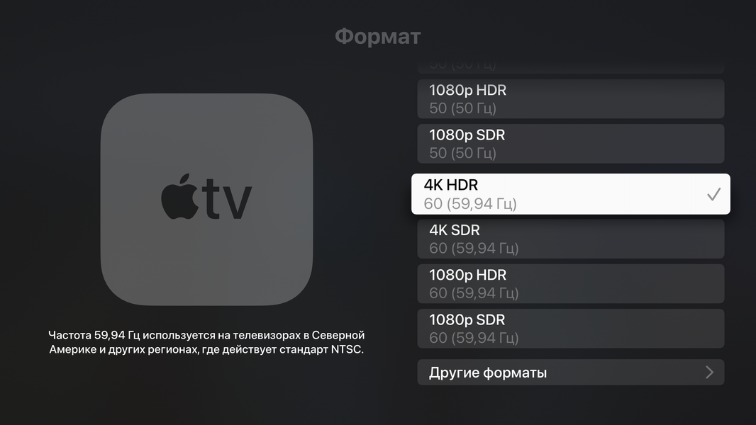 Например, здесь мы видим, что это не только 4К, но и Dolby Vision и Dolby Atmos. Для того, чтобы получить реальный Dolby Atmos, необходимо иметь поддержку на стороне аудиосистемы. Но, например, Dolby Atmos поддерживают наушники AirPods. Кстати, их весьма легко можно подключить к Apple TV: достаточно открыть футляр и зайти в настройки звука.