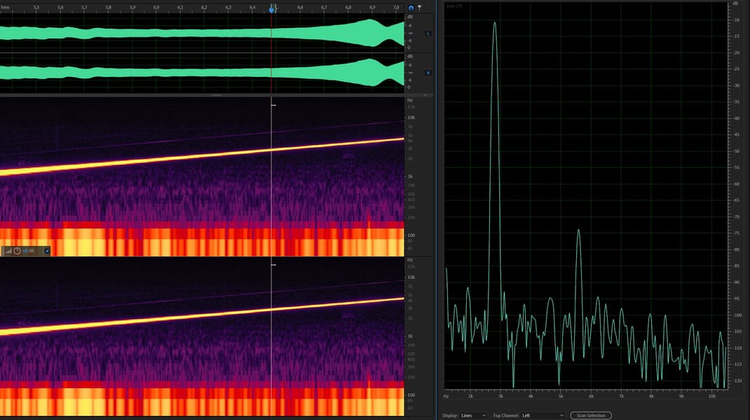 Наши измерения также подтверждают заявления производителя о менее 0,1% искажений. Даже в самых насыщенных искажениями местах скользящего тона при БПФ-анализе видно, что, во-первых, наблюдается всего одна вторая гармоника, которую человек практически не слышит, она маскируется основным тоном, а во-вторых, разница между амплитудой тона и гармоникой превышает 60 дБ, то есть составляет менее 0,1% (что легко считается по известной формуле 20 log10 (0,1% / 100) = 60 дБ).