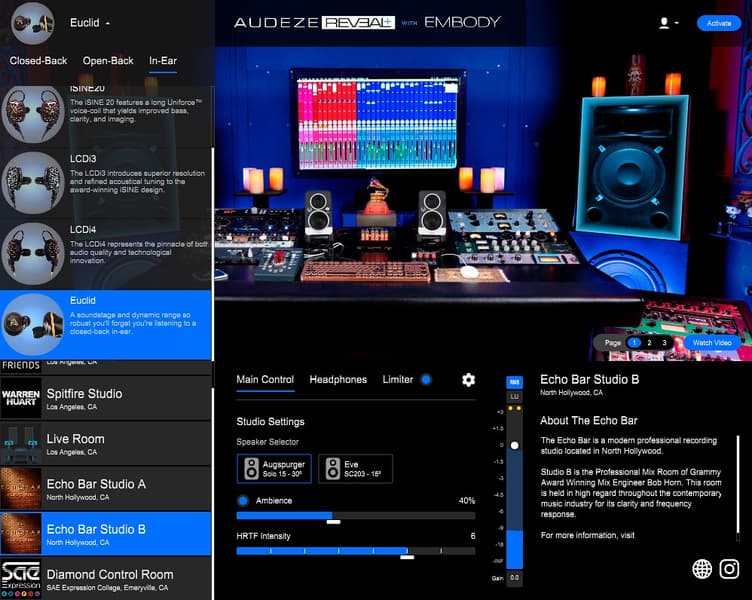 Виртуальная студия для музыкантов и звукорежиссеров Audeze Reveal+ поддерживает Euclid с версии 2.2 и позволяет применить HRTF-виртуализацию, чтобы вынести источники звука из головы в пространство, как если бы слушатель имел перед собой высококачественные колонки. Имеющимися настройками можно отрегулировать степень применения виртуализации от полного отключения до максимального эффекта. Нам больше всего понравился пресет голливудской студии Echo Bar Studio B, но это вопрос персональных предпочтений.