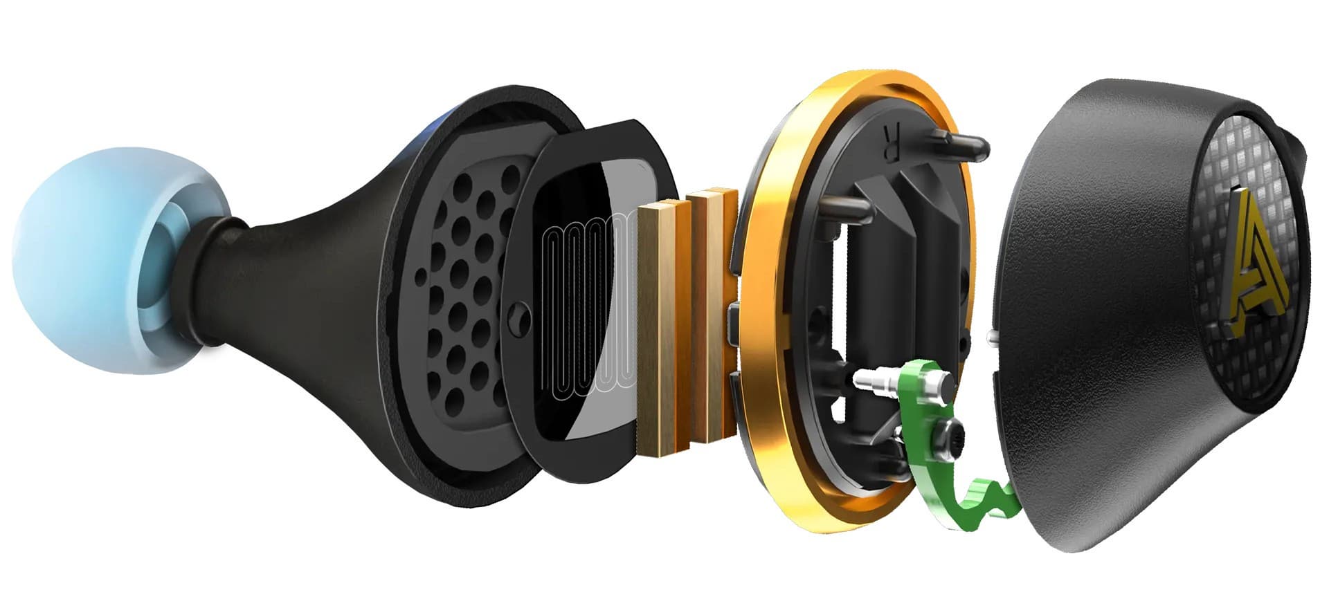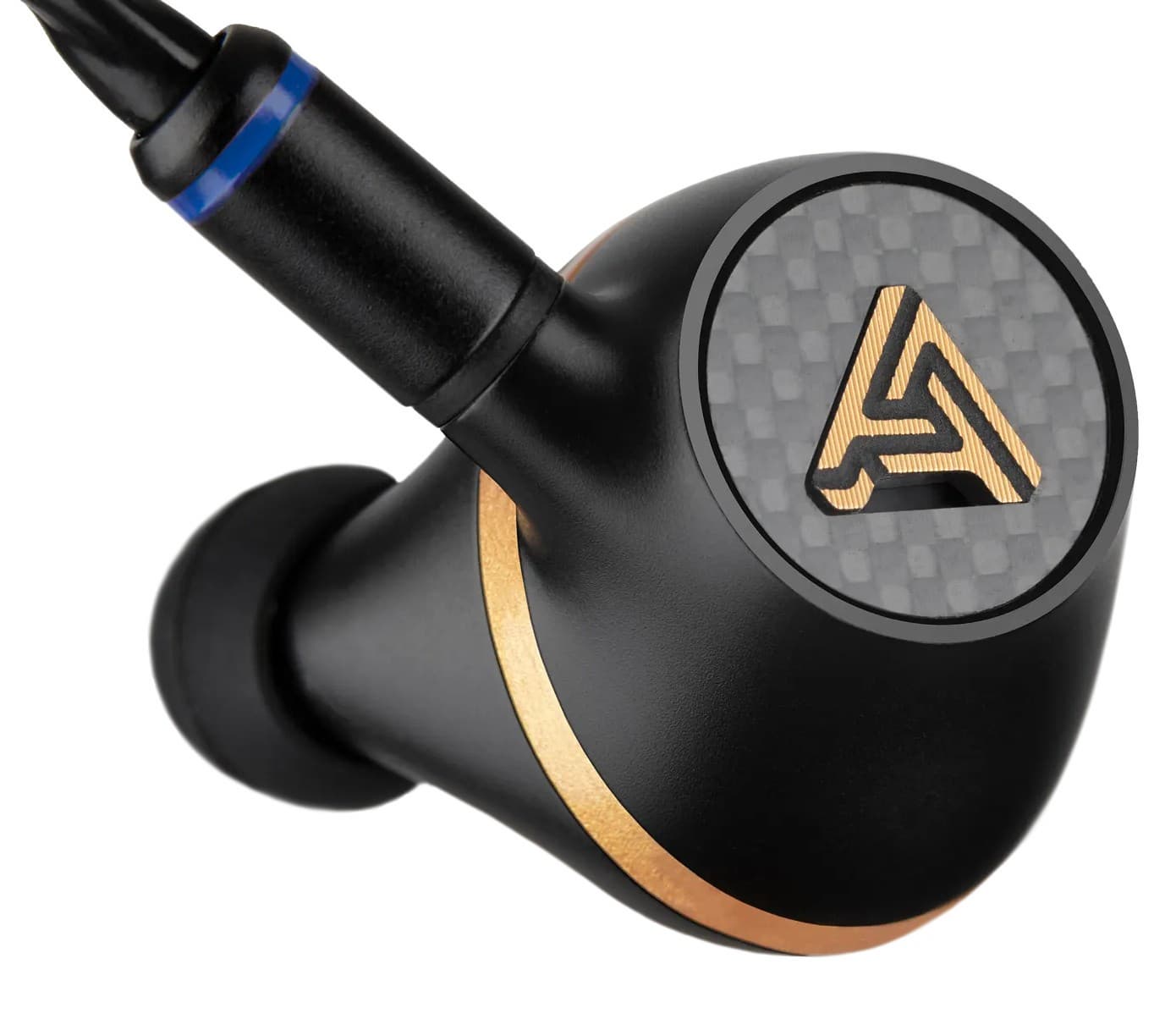Карбоновая вставка с металлизированным логотипом не несет никакой функциональной нагрузки. Если аккуратно подцепить ее иголочкой, то можно отклеить двусторонний скотч и увидеть под ней цельный алюминиевый корпус и небольшую прорезь, которая защищена изнутри фетром. На фотографии она замаскирована в нижней части буквы А. Очевидно, что это звуковой порт, который разгружает внутренний объем наушников и предотвращает бубнение на басах.