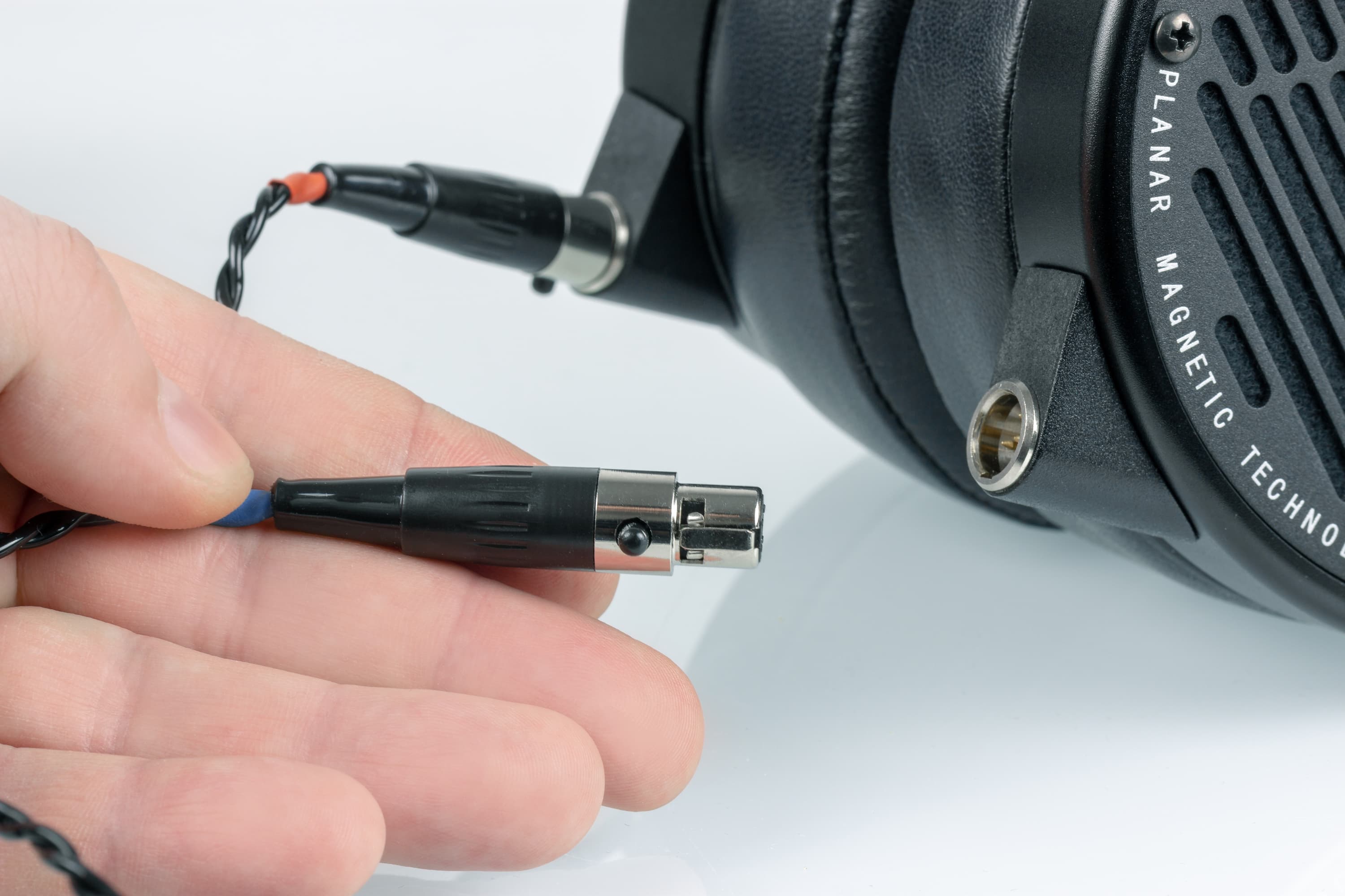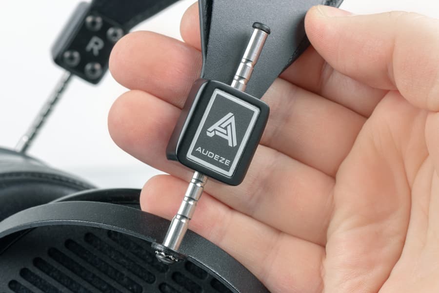 Кабели подключаются раздельно к каждому наушнику. В комплекте идет 2-метровый шнур ¼″ TRS (большой джек) на 4-контактные Mini-XLR. Отдельно можно докупить фирменный кабель на балансный 4-контактный полноразмерный разъем XLR. Подойдет кабель от любых аналогичных наушников Audeze, а также сторонних производителей.