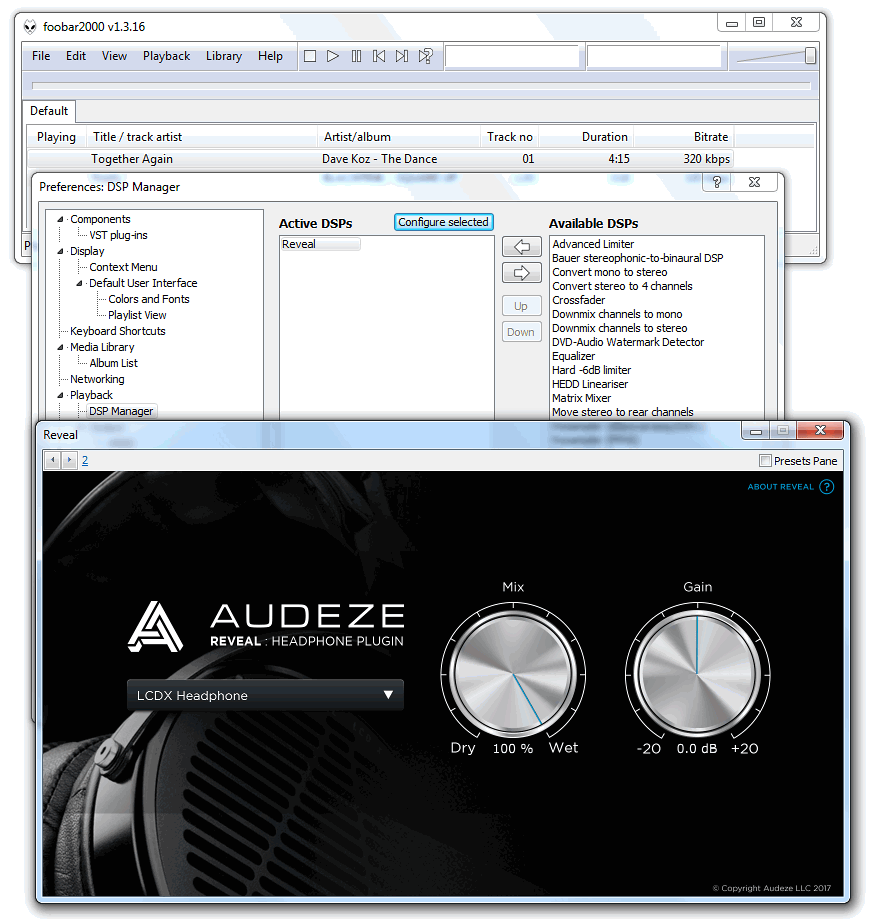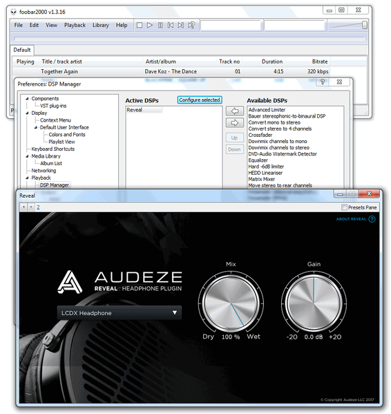 Производитель предлагает всем желающим скачать бесплатный плагин Audeze Reveal. Судя по нашим измерениям, плагин деликатно компенсирует основные неровности АЧХ. Все это можно реализовать и без плагина, практически в любом эквалайзере, используя график измерений. Плагин распространяется для PC и Mac, в форматах VST2/VST3 и AU. Мы подключили плагин в foobar2000 через адаптер VST2.4.