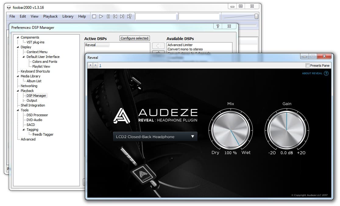 Производитель предлагает всем желающим скачать бесплатный плагин Audeze Reveal — судя по нашим измерениям, плагин деликатно компенсирует основные неровности АЧХ. Можно реализовать это и без плагина, практически в любом эквалайзере, используя график наших измерений или измерений производителя.