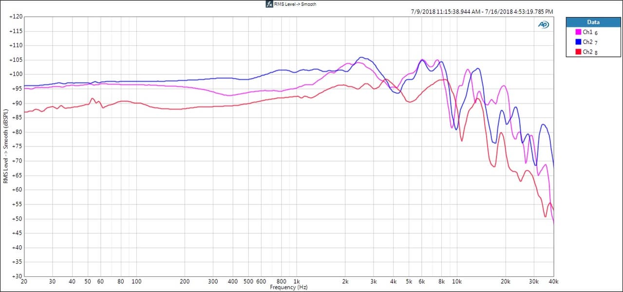 Все закономерности графиков сохраняются. К 400 Гц наблюдается небольшой спад, дальше к 2 кГц подъем, потом сильный спад до 5 кГц, пик на 6 кГц и 12 кГц.