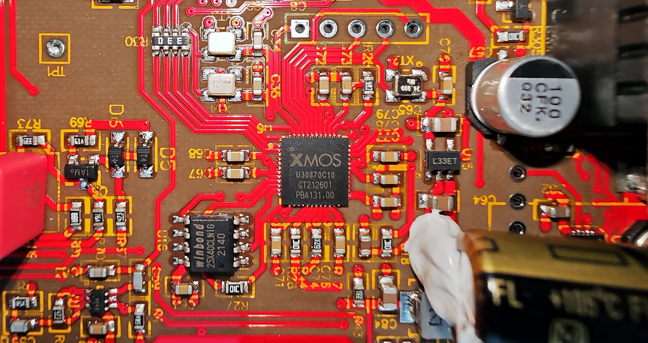 За поддержку USB отвечает XMOS U30870C10, левее и ниже виден цифровой регенератор WM8805 (SRC), занимающийся преобразованием сигнала со входа S/PDIF, который дальше отправляется на ЦАП.