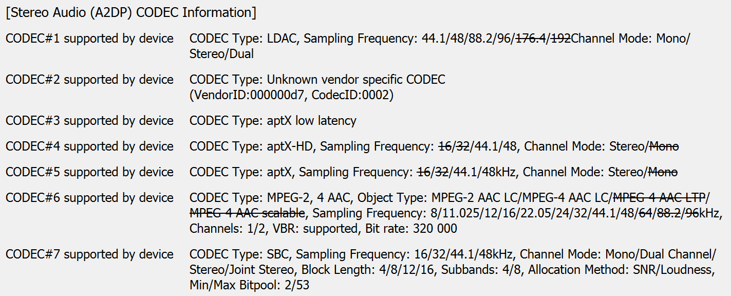 Беспроводное соединение устанавливается привычным образом: активируем соответствующий вход, некоторое время Aune Audio Flamingo пытается подключиться к уже «знакомым» устройствам, если не получается — активирует режим сопряжения. Полный список поддерживаемых кодеков и их режимов традиционно был получен с помощью утилиты Bluetooth Tweaker. Список впечатляющий: помимо базового SBC прибор поддерживает AAC, aptX, aptX LL, aptX-HD и даже LDAC.