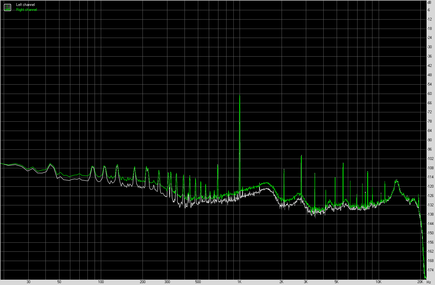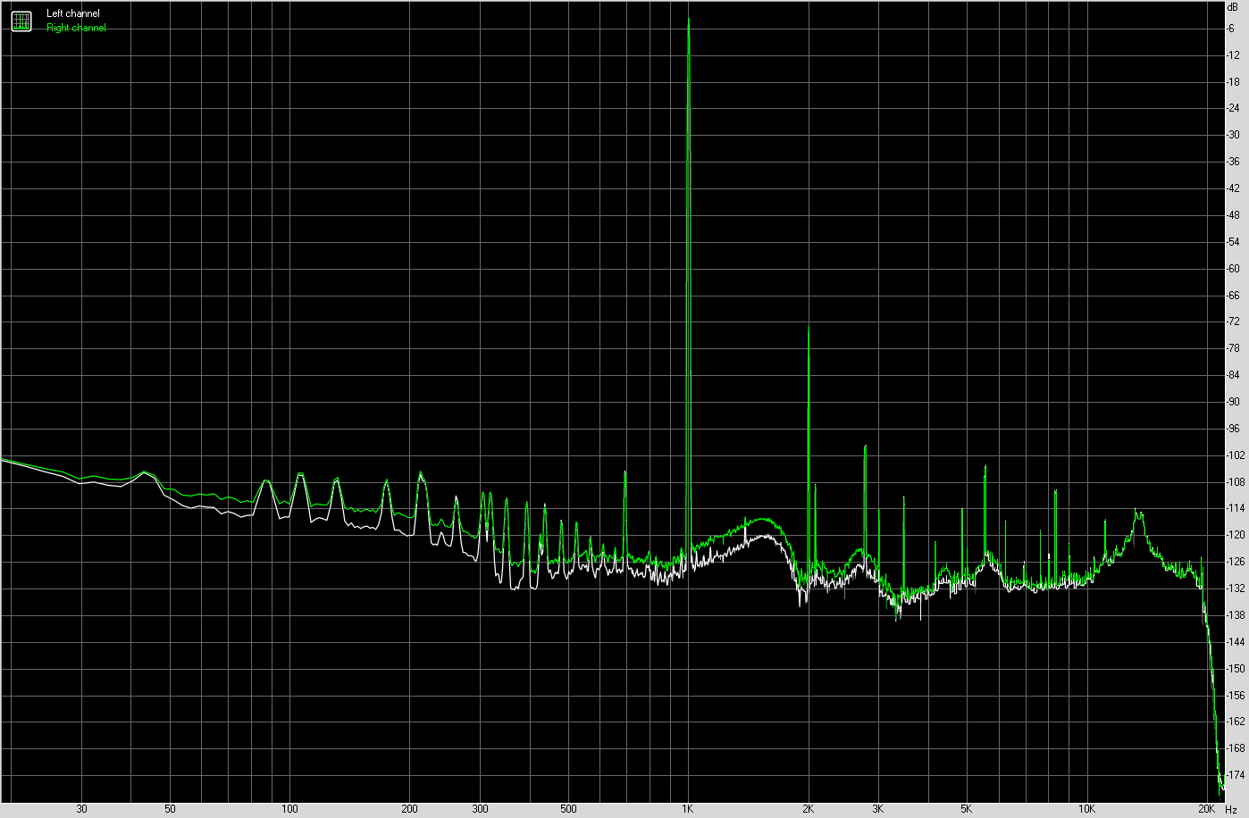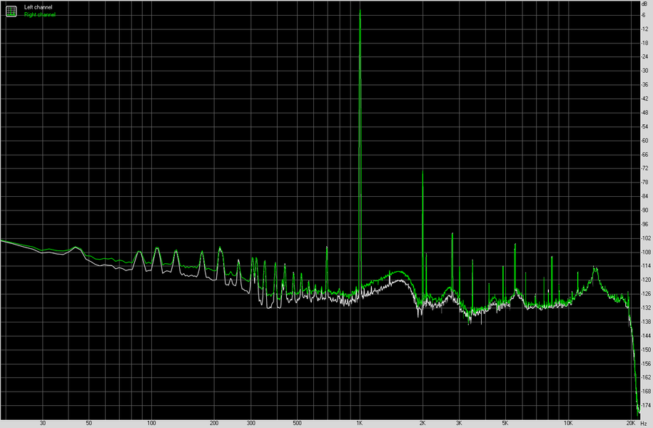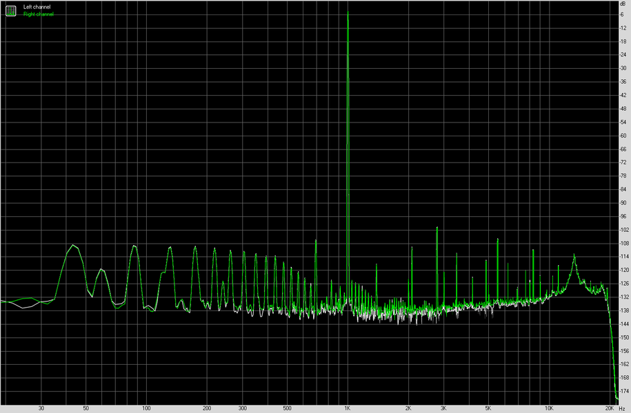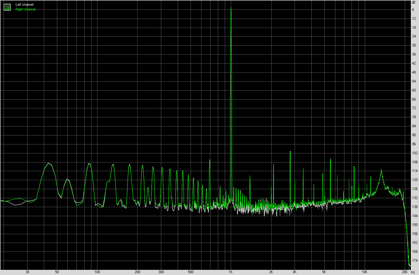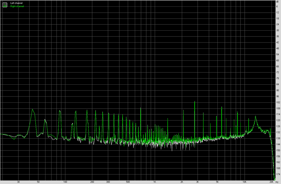 Измерения проводились с помощью АЦП E1DA Cosmos в режиме 24 бит/96 кГц. А приводятся они, как мы всегда отмечаем, исключительно как иллюстрации — делать на их основе однозначные выводы о качестве устройства не следует. Первую серию измерений мы провели в режиме OP — без задействования встроенной лампы. Общая оценка — очень хорошо. Учитывая специфику и далеко не самую высокую стоимость устройства, это успех.