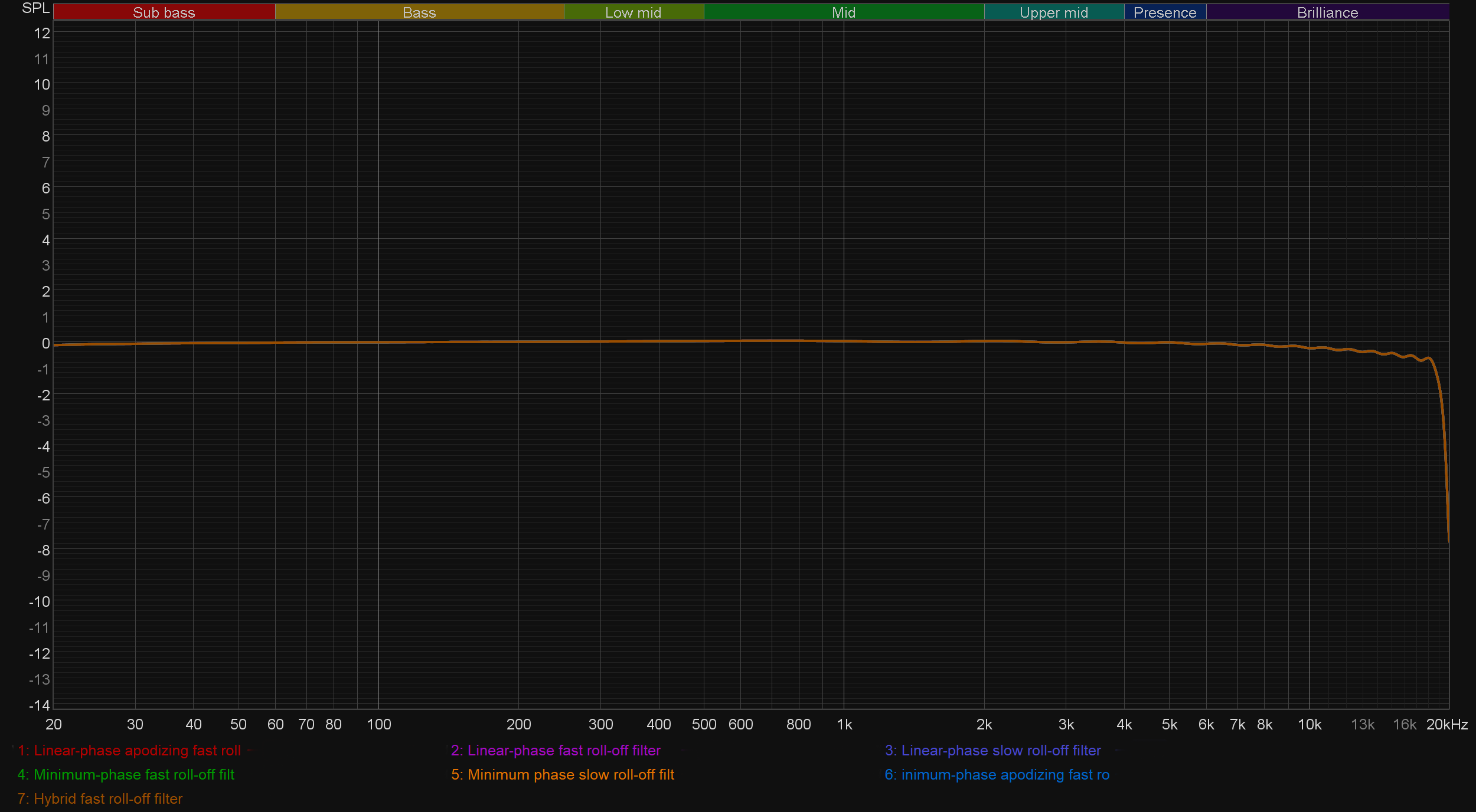 - Linear-phase apodizing fast roll-off filter или аподизирующй линейно-фазовый фильтр с быстрым спадом. Вид линейно-фазового фильтра с улучшенным пост- и пре-эхом. Нейтральное, уравновешенное и чуть менее насыщенное звучание.