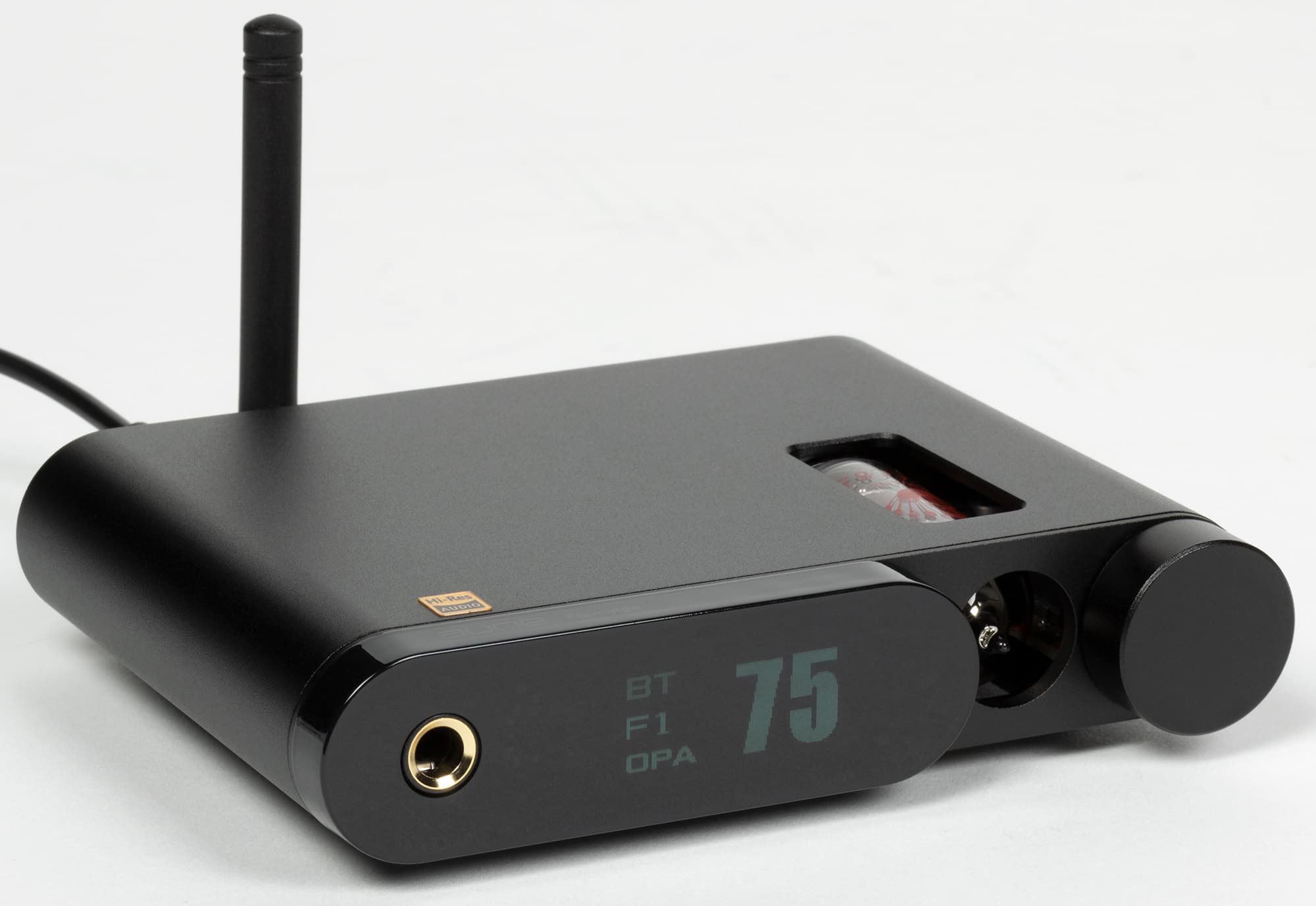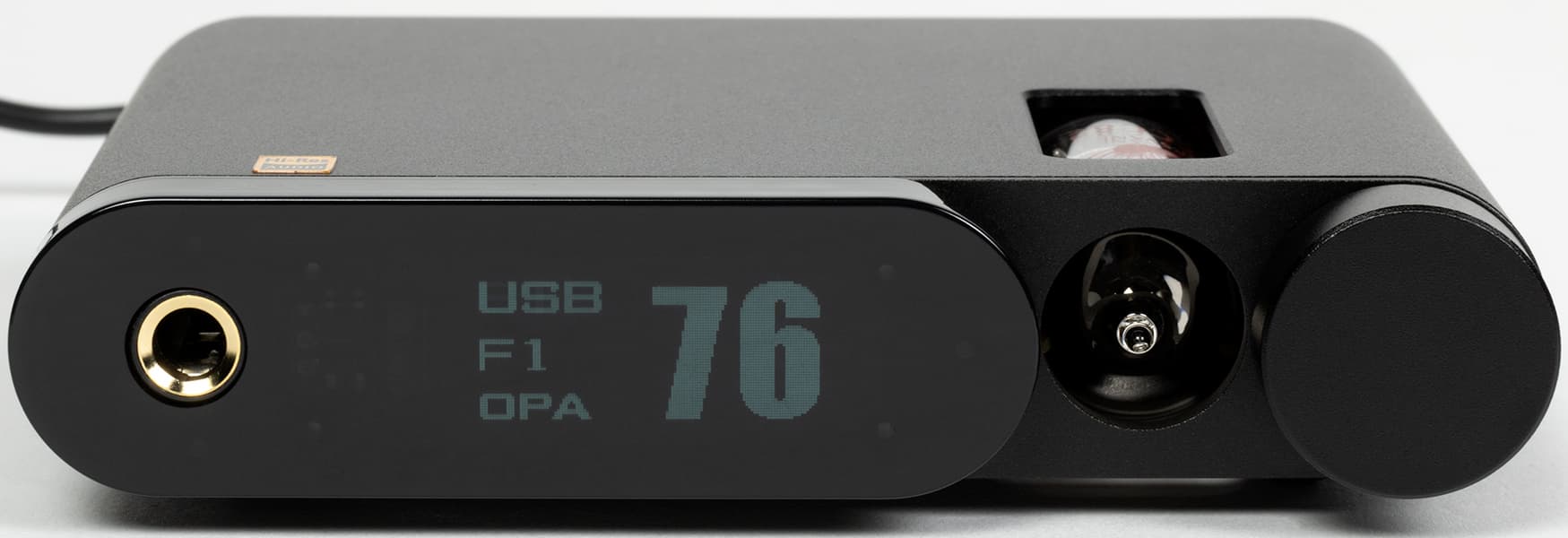 Сверху мы видим еще одно окошко лампы, логотип сертификации Hi-Res Audio и название устройства. Вновь никаких лишних «украшательств», что в данном случае идет только на пользу внешнему виду прибора.