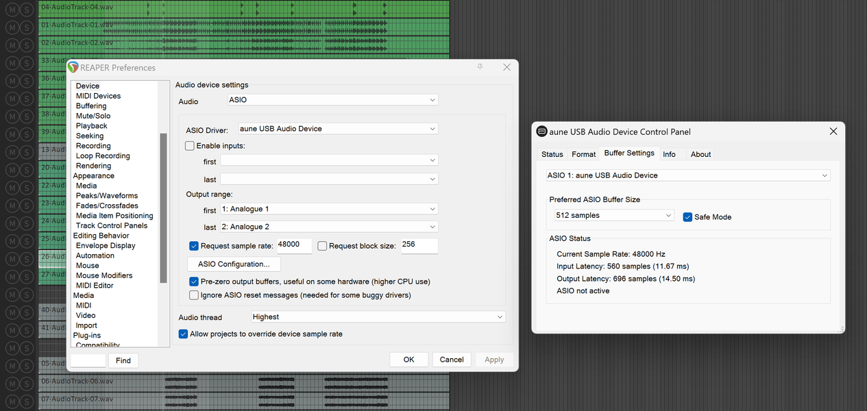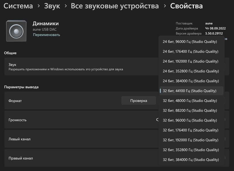 При подключении Aune Audio Flamingo определяется системой, максимально доступный уровень разрешения — 32 бит и 384 кГц, всё как заявлено.