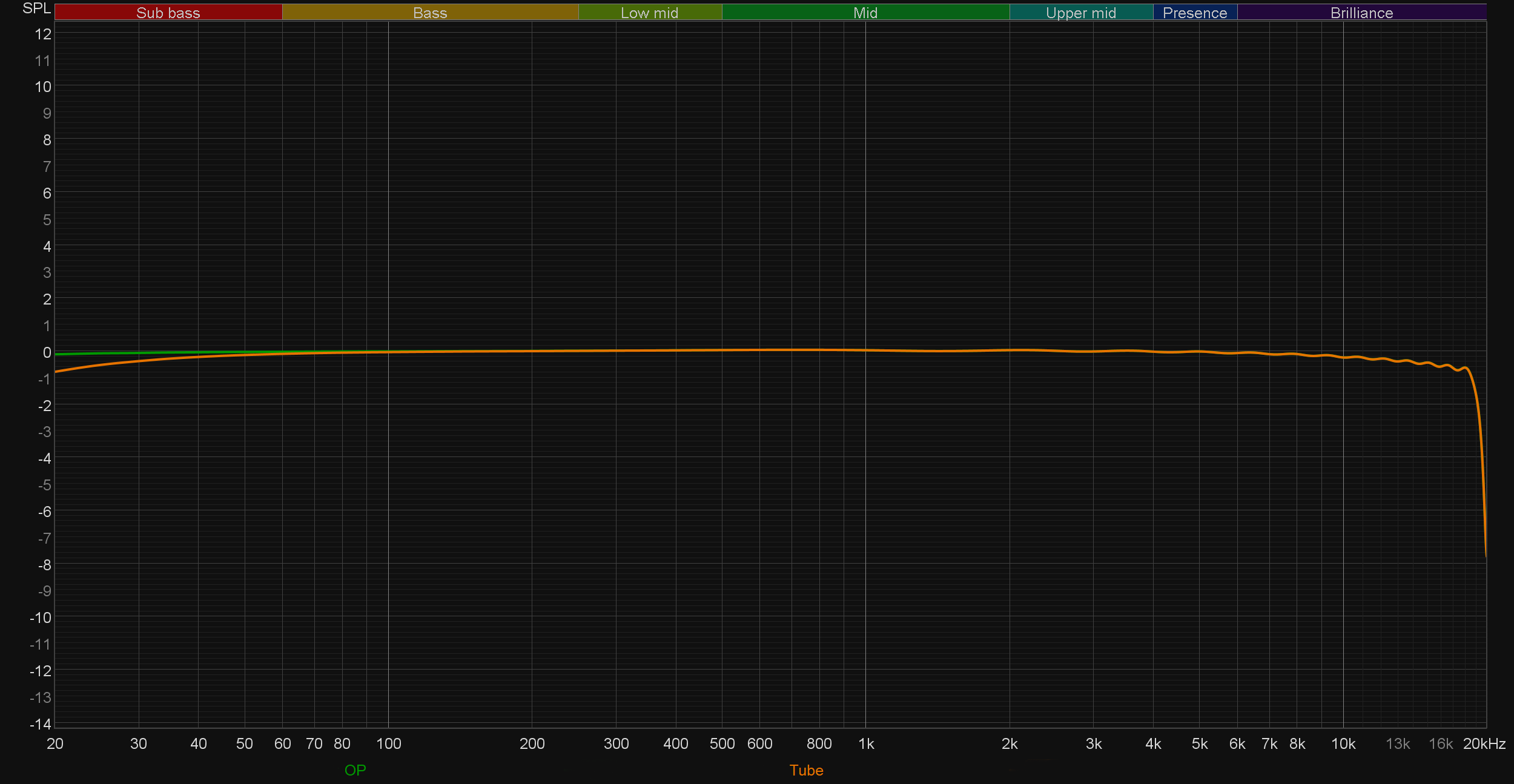 Графики АЧХ в режимах OP и Tube тоже практически совпали, хотя в области глубокого баса у «лампы» есть маленький провал.