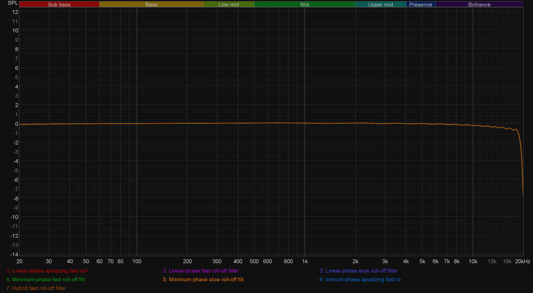 - Minimum phase slow roll-off filter или минимально-фазовый фильтр с медленным спадом. Фильтр с минимальным пре- и пост-эхом. Как следствие, насыщенные НЧ и хорошо артикулированные атаки.
