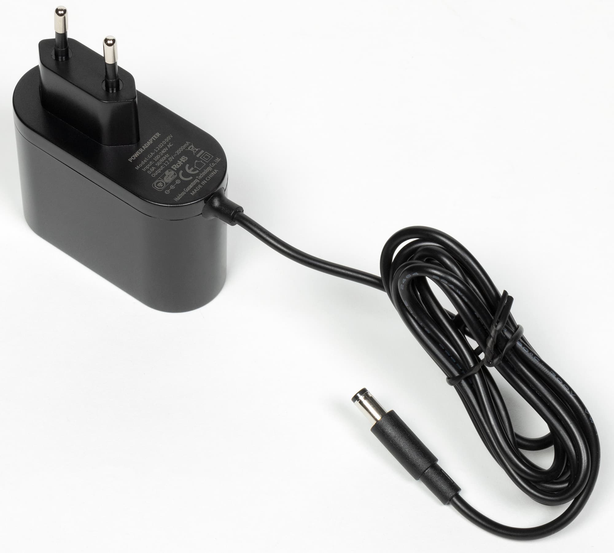 Блок питания компактный, его технические параметры можно увидеть на иллюстрации ниже. Корпус выполнен из маркого глянцевого пластика, но прикасаться к нему часто нет никакой необходимости. Длина несъемного кабеля — 1,5 метра.