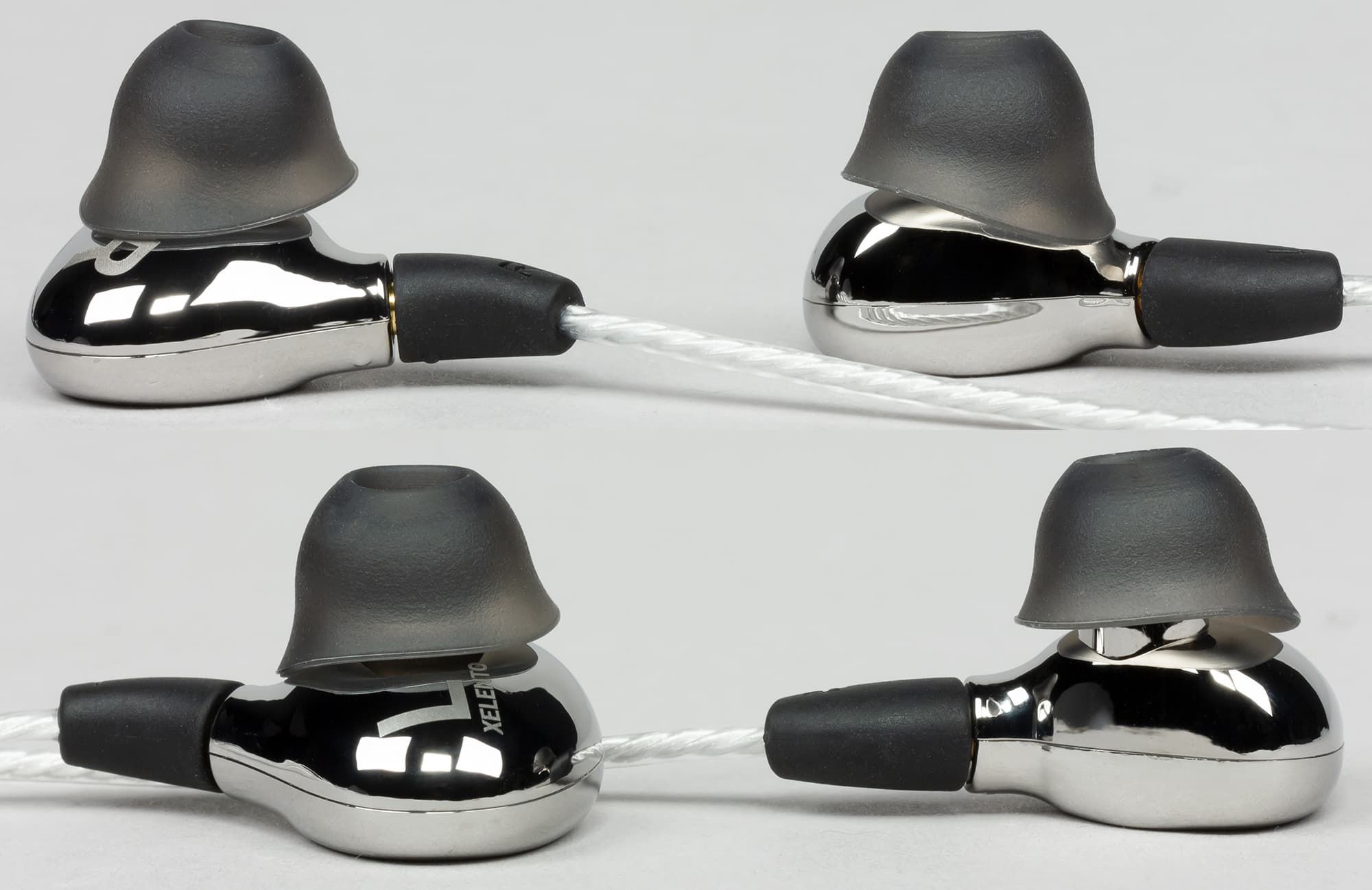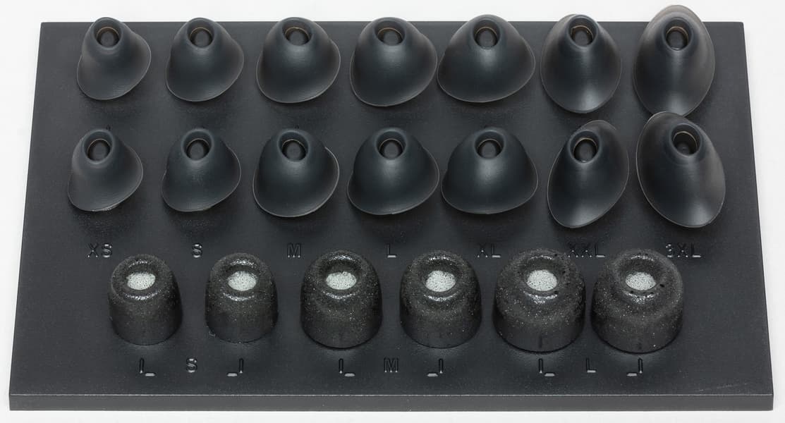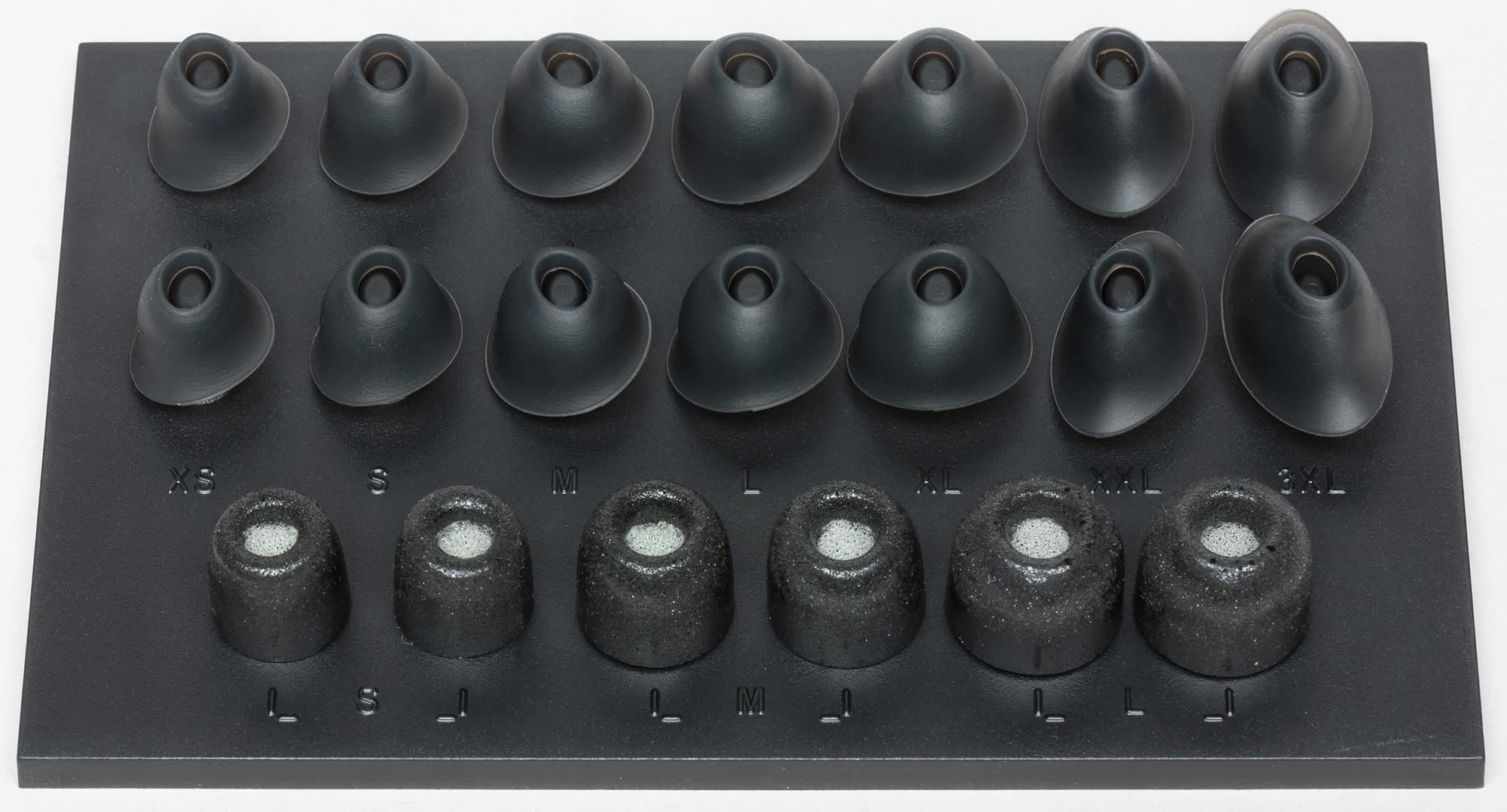Следующее, что необходимо обязательно сделать — это подобрать наиболее подходящую для себя пару амбушюров. Их в комплекте 10 пар, времени на эксперименты может уйти достаточно много, но оно того стоит. Форма силиконовых амбушюров сильно отличается от привычной округлой, при этом она заметно изменяется вместе с увеличением их размеров. Сделано это, как несложно догадаться, для обеспечения лучшего контакта со слуховым проходом. Благодаря этому Beyerdynamic Xelento крайне комфортно располагаются в ухе, а для достижения хорошего уровня звукоизоляции и передачи низких частот их не надо помещать слишком глубоко. Вырез в середине сделан овальным, чтобы совпадать с отверстием звуководов. Пенные амбушюры Сomply обладают более «классической» формой.