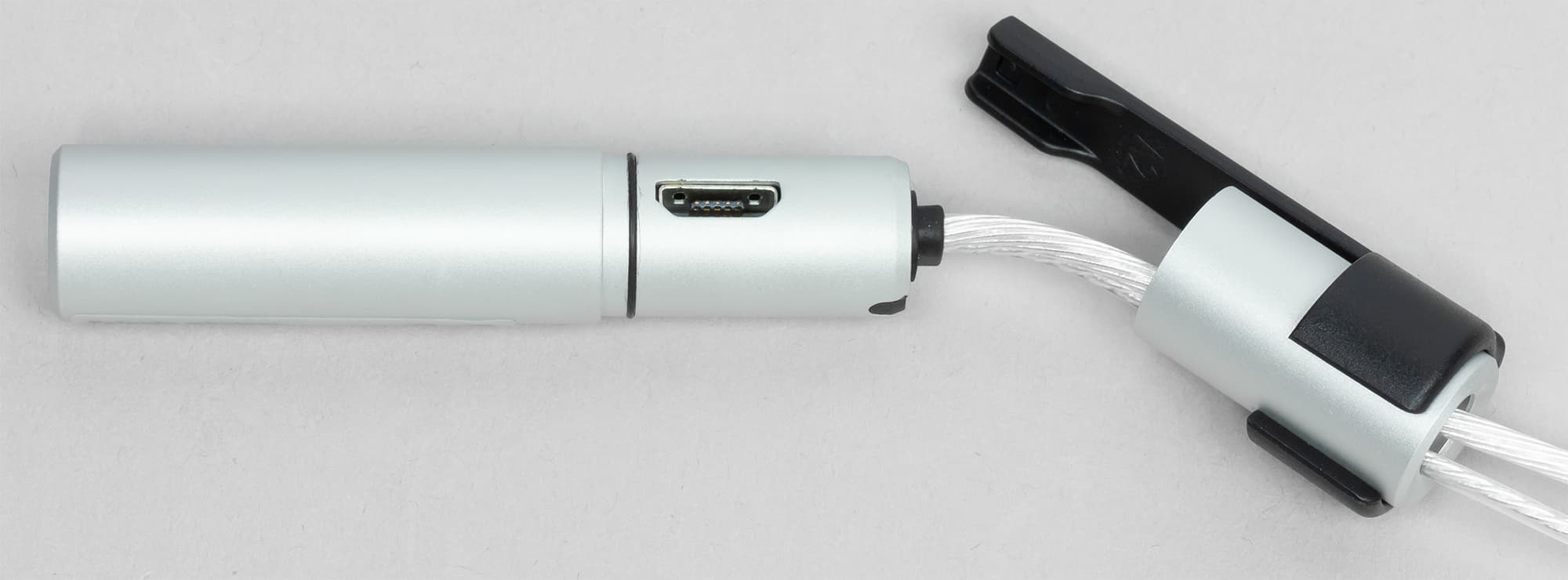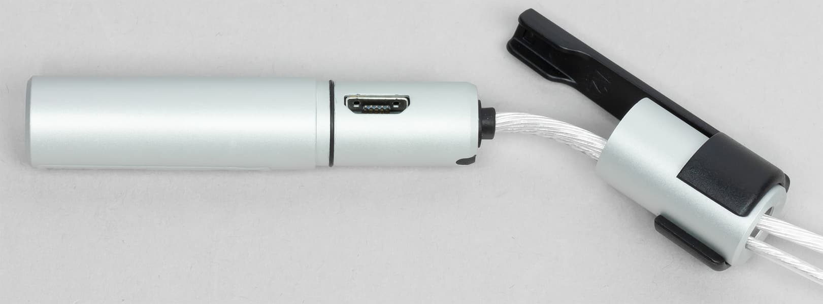 Для крепления провода к одежде в комплекте есть специальный металлический зажим с логотипом производителя.