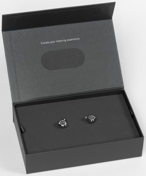 Самое интересное начинается дальше. Внутри покупателя ждет полностью черная коробка с откидывающейся крышкой, а под крышкой — наушники, закрепленные на собственном ложементе. Смотрится крайне впечатляющие, действительно очень напоминает ювелирное украшение.