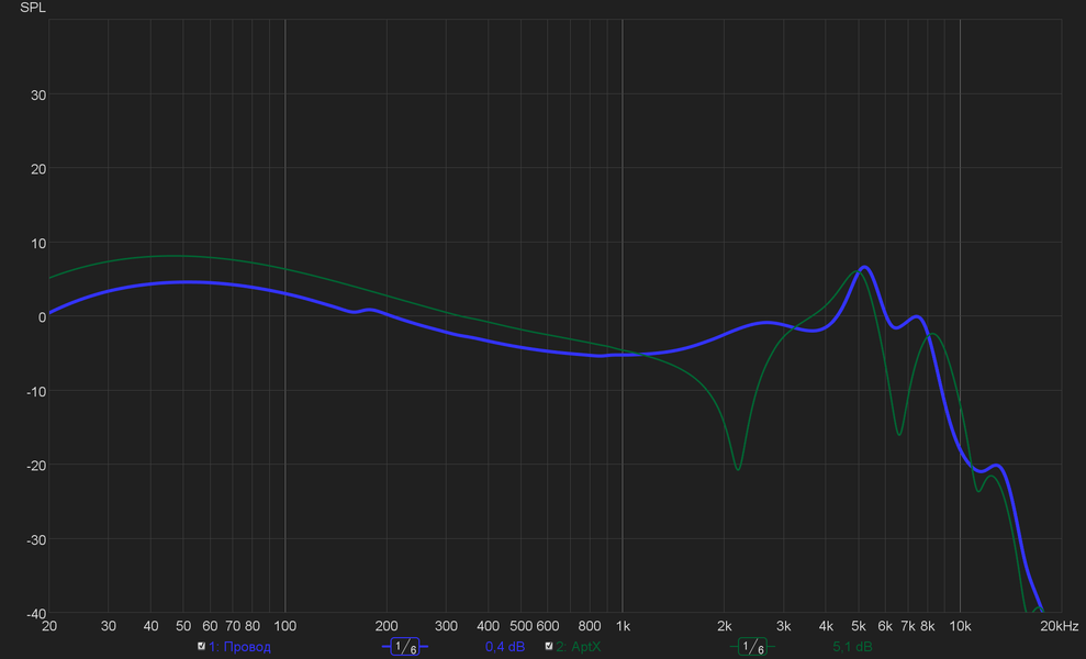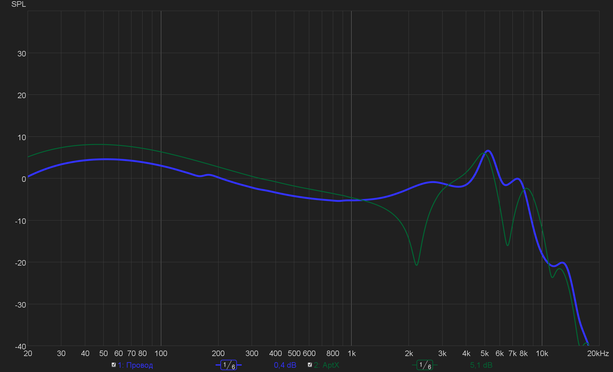 Звучание наушников при проводном подключении довольно разительно отличается, что заметно и на сравнении графиков АЧХ ниже. Сразу оговоримся, что разница в звучании любых наушников при использовании беспроводного подключения с различными кодеками связана не только и не столько с особенностями самих кодеков, сколько с настройками встроенного DSP для работы с ними. Первое, что бросается в глаза при взгляде на графики — отсутствие в случае проводного подключения провала около 2 кГц. Это подтверждает наше предположение о том, что для беспроводного подключения он был сделан осознанно.