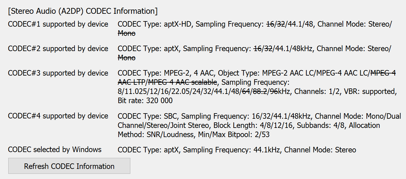 Посмотрим на то, какие еще кодеки и в каких режимах поддерживает гарнитура. Для этого подключимся к устройству под управлением Windows и воспользуемся утилитой Bluetooth Tweaker. Гарнитура поддерживает параллельное подключение к нескольким устройствам, при этом приоритет отдается первому из сопряженных.