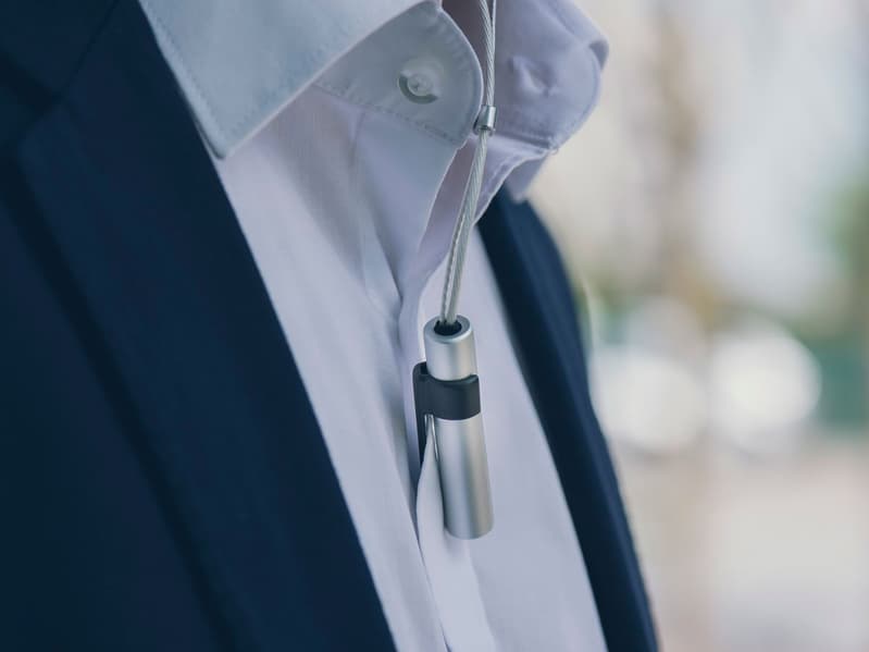 Основной блок имеет цилиндрическую форму и оснащен клипсой для крепления к одежде.