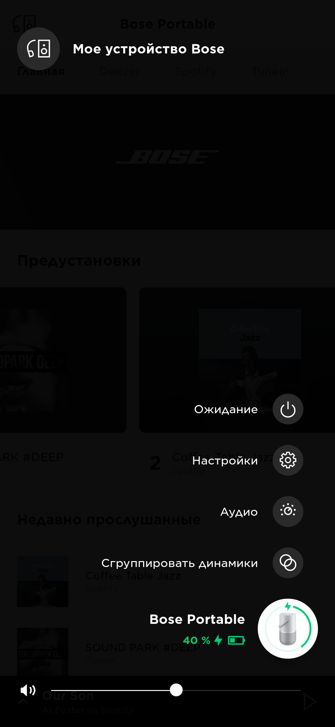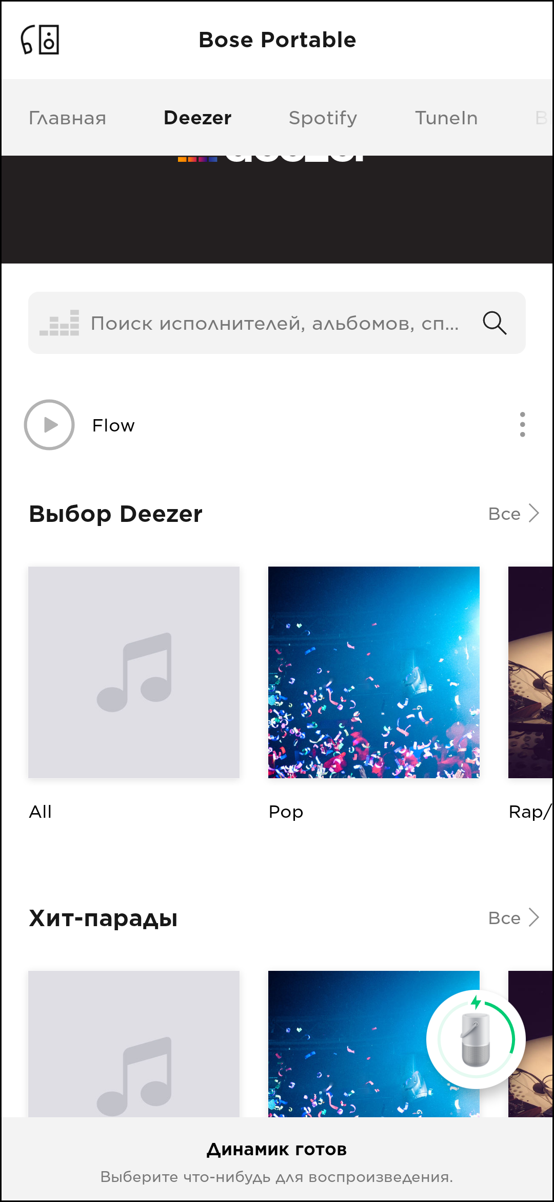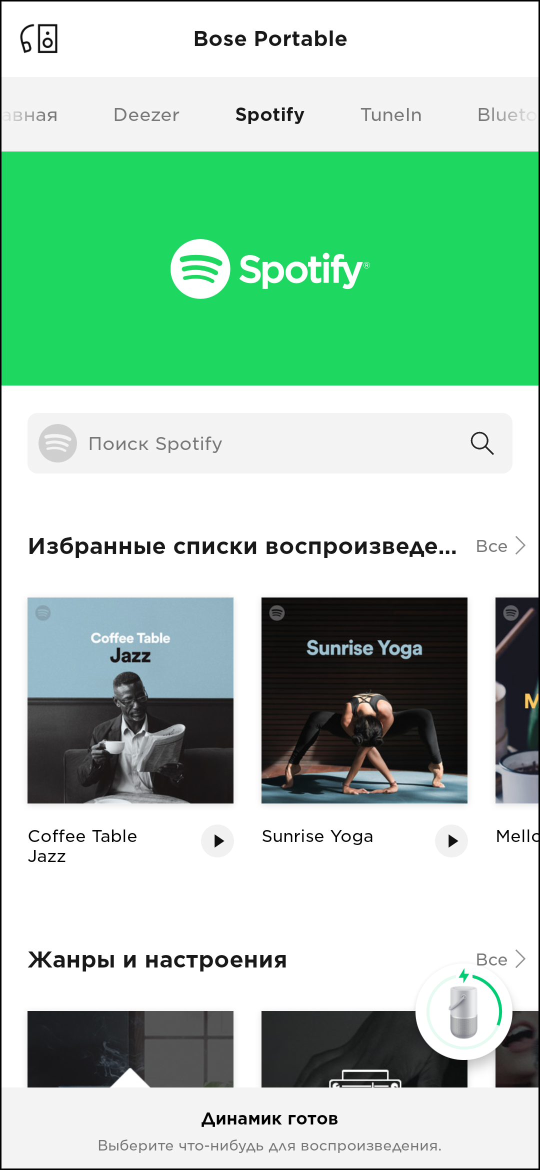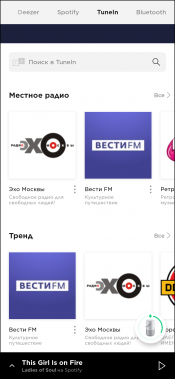 Добавленные стриминговые сервисы отображаются на отдельных вкладках, где можно найти свои плейлисты, списки избранного и прочее — почти как в соответствующих приложениях. Немного непривычно, но в целом довольно удобно. Радиостанции можно слушать через сервис TuneIn, который добавляется по умолчанию. Текущая композиция или выбранная радиостанция отображаются во встроенном плеере, который позволяет полностью управлять воспроизведением, в том числе — добавлять звучащую композицию в избранное.