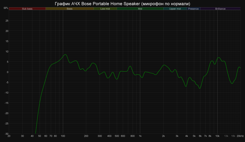 Производитель анонсирует «мощный бас», и он действительно присутствует. При этом лишних акцентов на низкочастотном диапазоне нет — он подчеркнут, но не «бубнит» и подается довольно отчетливо благодаря тому, что воспроизводить «глубокий бас» колонка даже не пытается. Как говорится, нужно ставить перед собой реальные цели — разработчики Bose Portable Home Speaker поступили именно так и не прогадали. На высоких уровнях громкости в НЧ-диапазоне появляются заметные искажения. Но использовать колонку в режиме «все ручки вправо» нет совершенно никаких причин — она очень громкая, на близких к максимальным значениям громкости находится рядом становится некомфортно, для озвучивания комнаты средних размеров хватает примерно половины от имеющегося запаса.