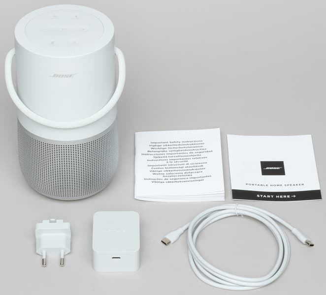 В комплект поставки Bose Portable Home Speaker входят сама колонка, документация, кабель USB-C—USB-C для зарядки, а также ЗУ со съемной вилкой (формат вилки зависит от страны поставки).