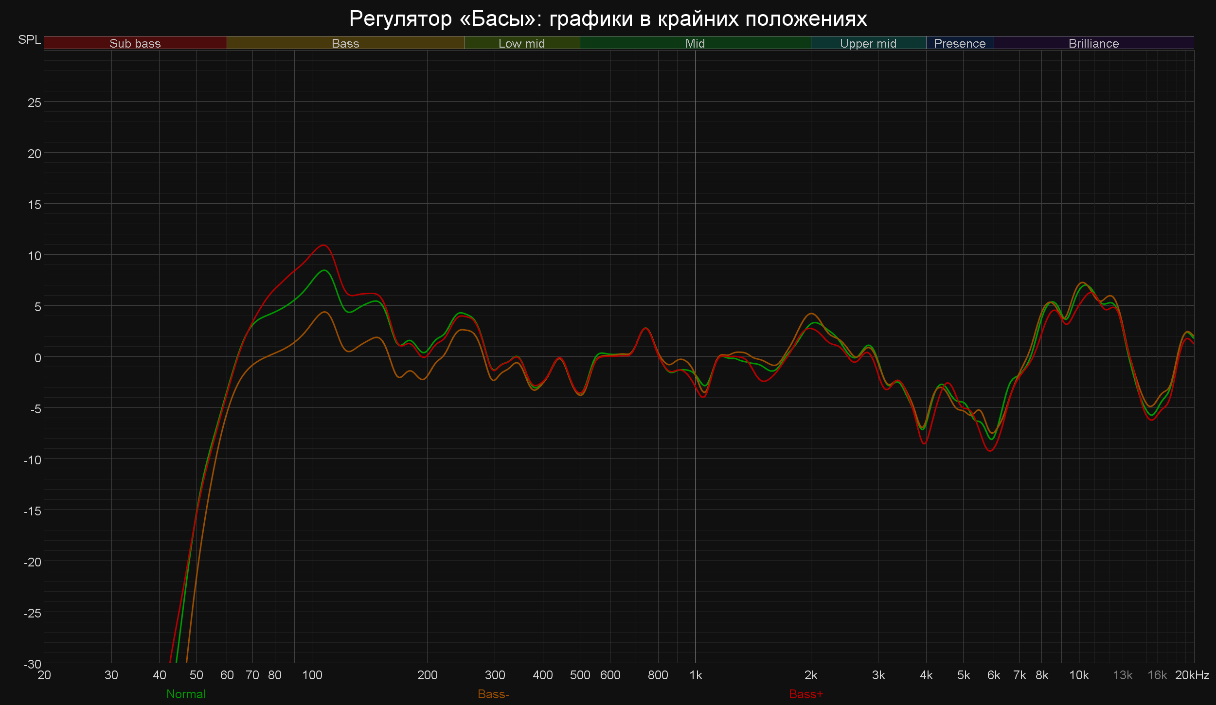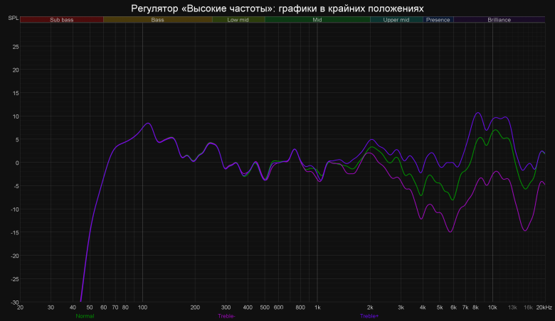 Регуляторы НЧ и ВЧ работают очень деликатно. Изменения видны на графиках и заметны на слух, скорректировать звучание колонки они вполне позволяют. Что весьма важно, так как других возможностей подстроить звук под себя при воспроизведении контента потоковых сервисов не предусмотрено. Ну а при Bluetooth-подключении всегда можно воспользоваться эквалайзером на источнике.