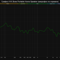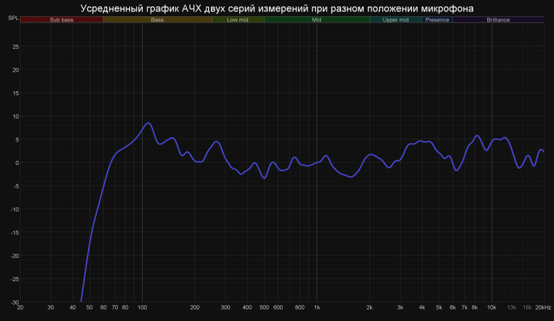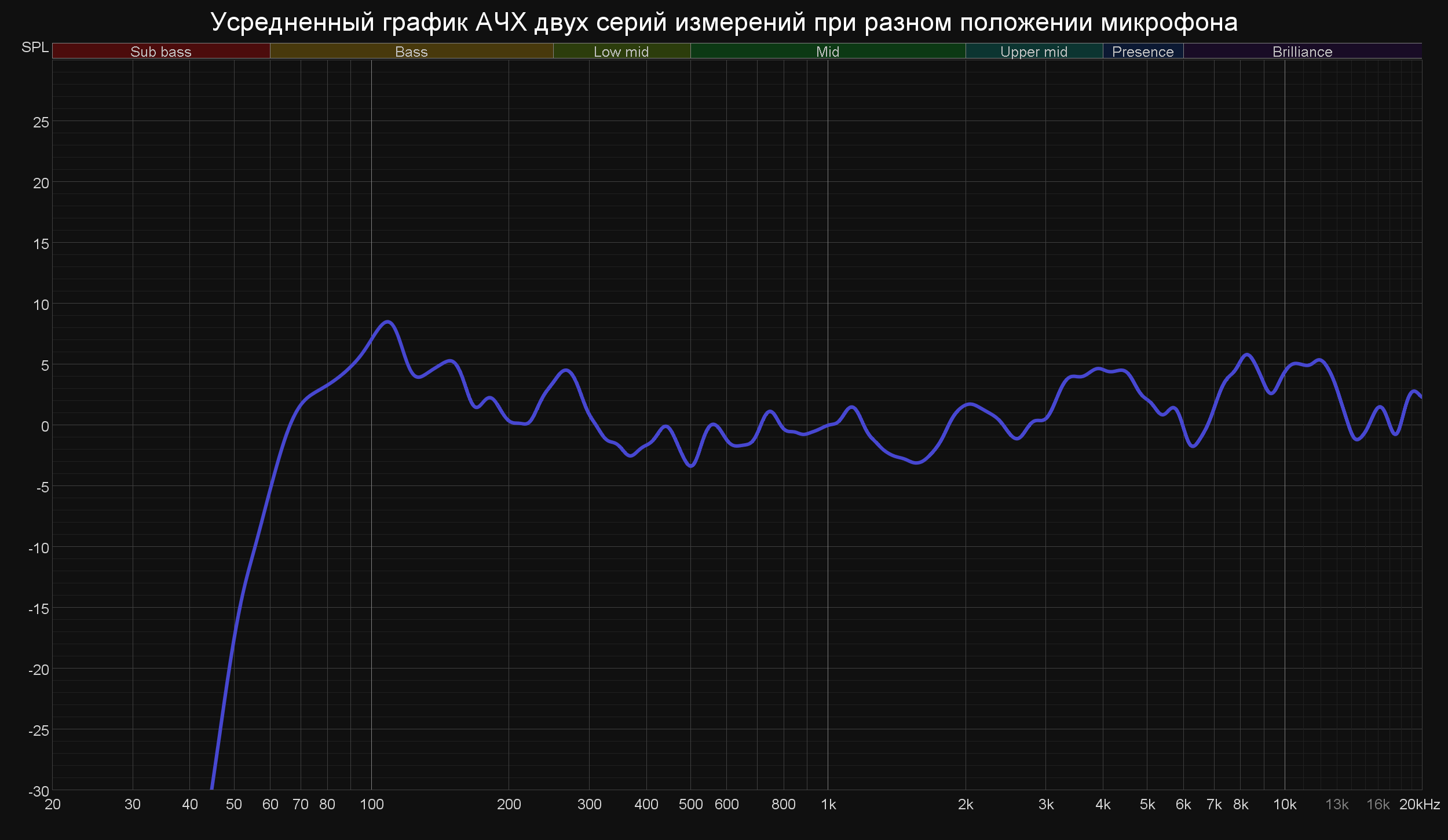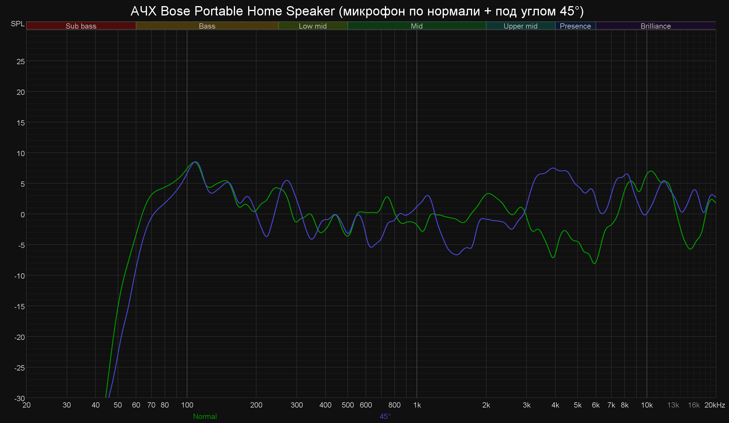 Первый график мы получили, расположив микрофон по нормали к колонке на расстоянии в 60 см. Между тем при реальном использовании устройство часто находится примерно на уровне пояса слушателя — где-нибудь на столе, например. Поэтому поднимаем микрофон выше — располагаем его примерно под углом 45°, после чего на месте провала видим заметный подъем. Усредняем оба графика — получаем максимально приближенную к опыту реального прослушивания картину.
