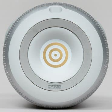 По форме устройство похоже на маленькое ведерко с ручкой, а еще больше — на бидон. Варианта расцветки два: белый и черный, у нас на тесте был первый. В нижней части корпуса расположена сетка динамика, сверху вмонтирована ручка для переноски. Покрытие ручки выполнено из приятного на ощупь материала, обеспечивающего хорошее «сцепление» с ладонью при переноске. Рифленая поверхность склонна к накоплению загрязнений, которые особенно заметны на светлом фоне — покупателям белой версии стоит иметь это в виду.