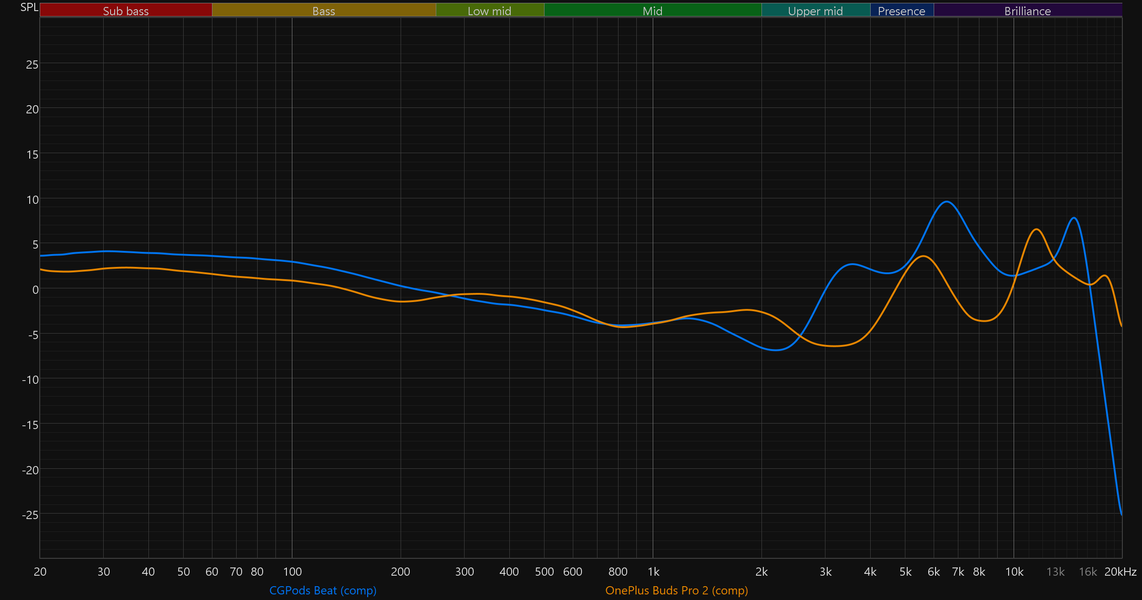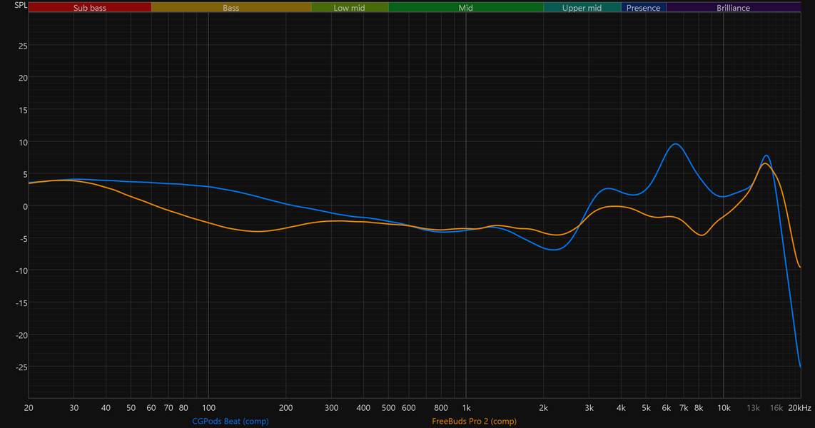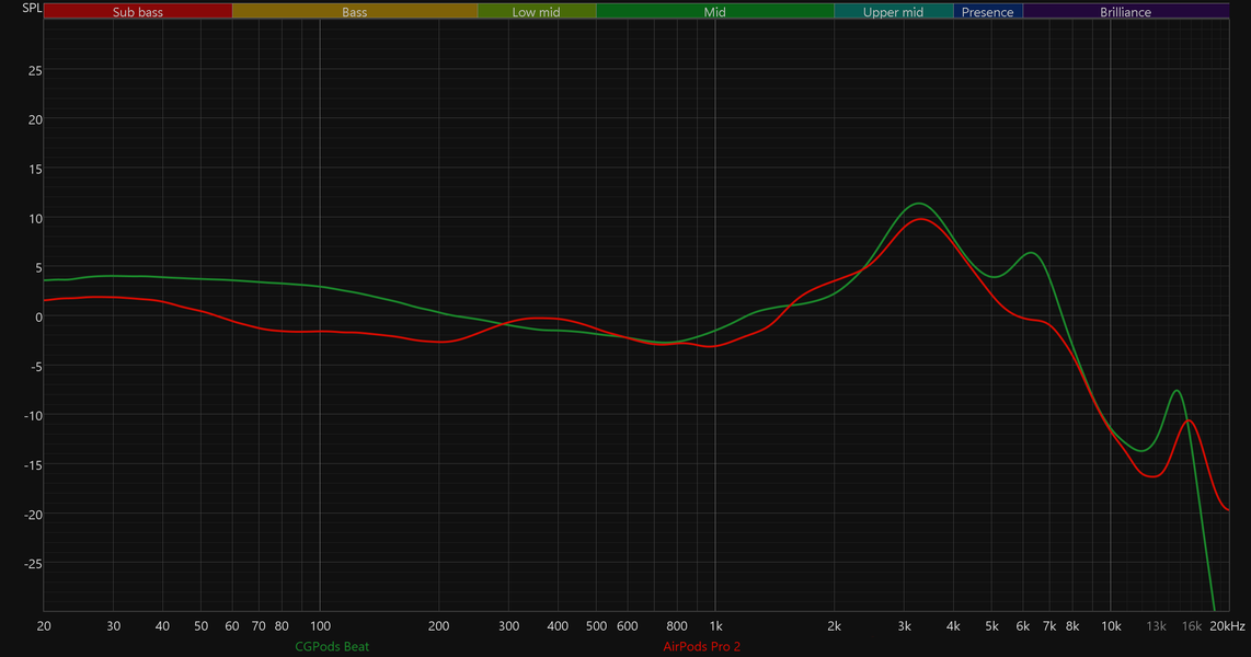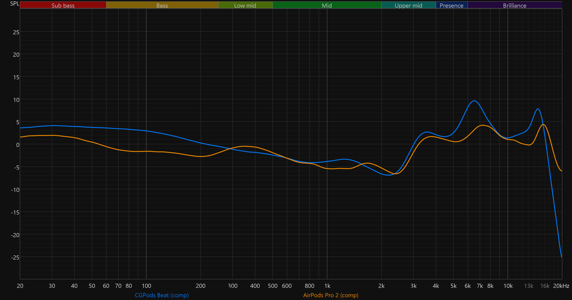 Продолжать можно бесконечно, не будем увлекаться. Продавцы всей серии CGPods ну очень любят сравнивать свой продукт с AirPods. Сравнение явно не слишком корректное — слишком уж велика пропасть и в плане удобства управления, и в плане качества звучания, и в плане интеграции в общую «экосистему». Но раз уж производитель настаивает: наложим друг на друга графики АЧХ Apple AirPods Pro 2 и тестируемых наушников, комментировать не будем.