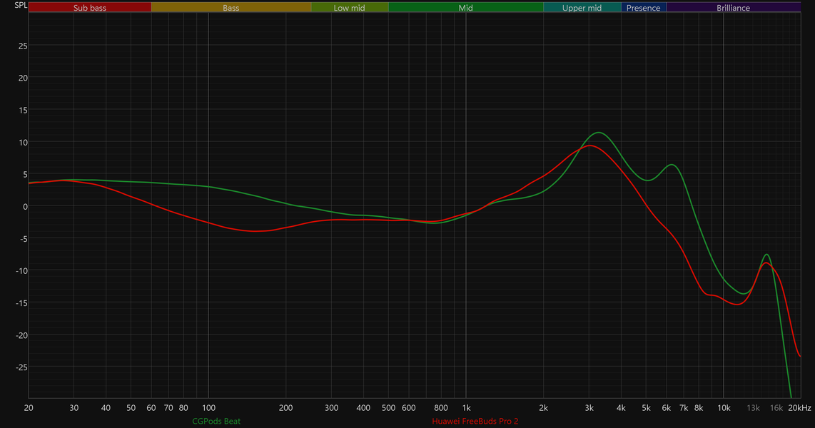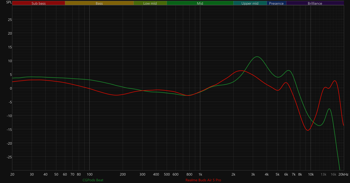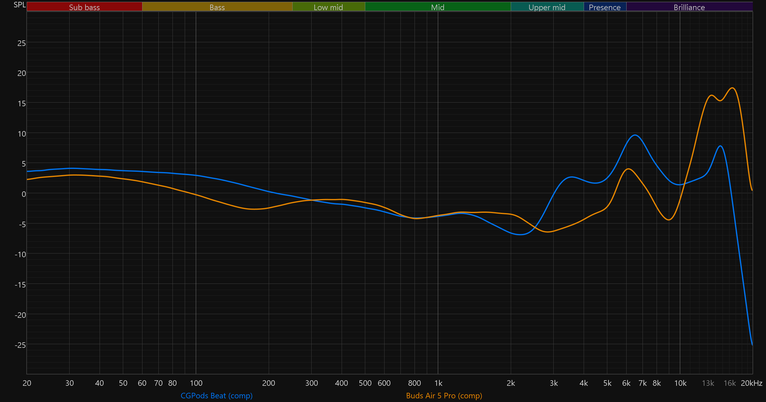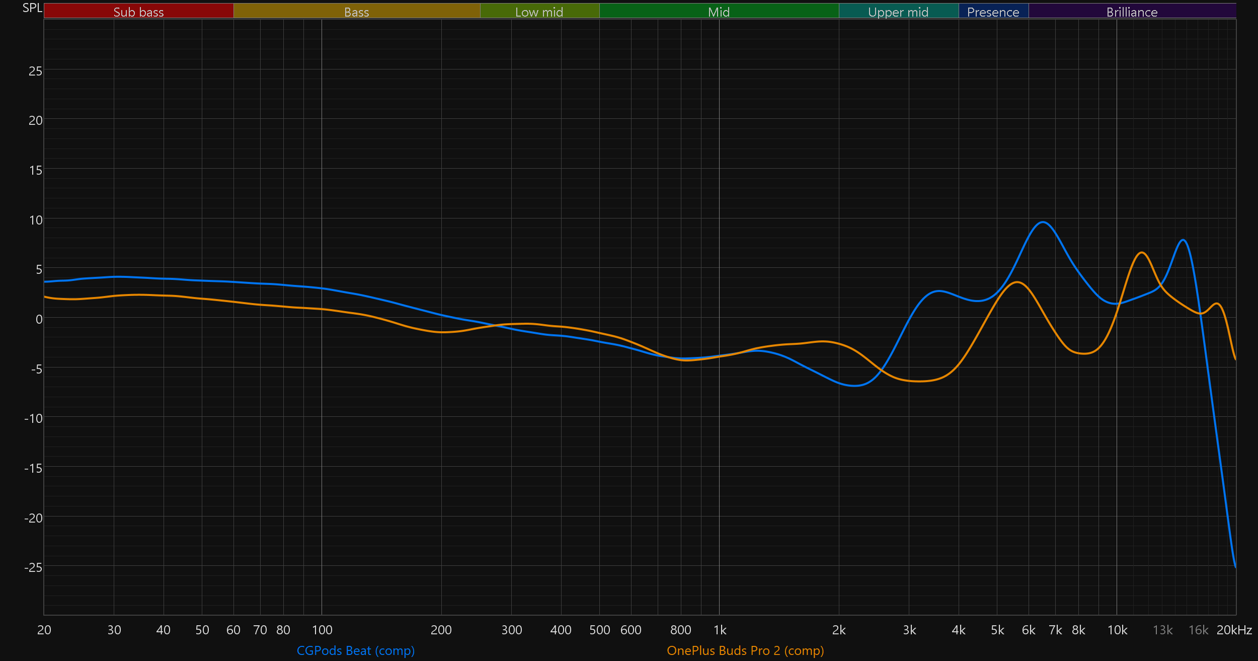 Продолжать можно бесконечно, не будем увлекаться. Продавцы всей серии CGPods ну очень любят сравнивать свой продукт с AirPods. Сравнение явно не слишком корректное — слишком уж велика пропасть и в плане удобства управления, и в плане качества звучания, и в плане интеграции в общую «экосистему». Но раз уж производитель настаивает: наложим друг на друга графики АЧХ Apple AirPods Pro 2 и тестируемых наушников, комментировать не будем.
