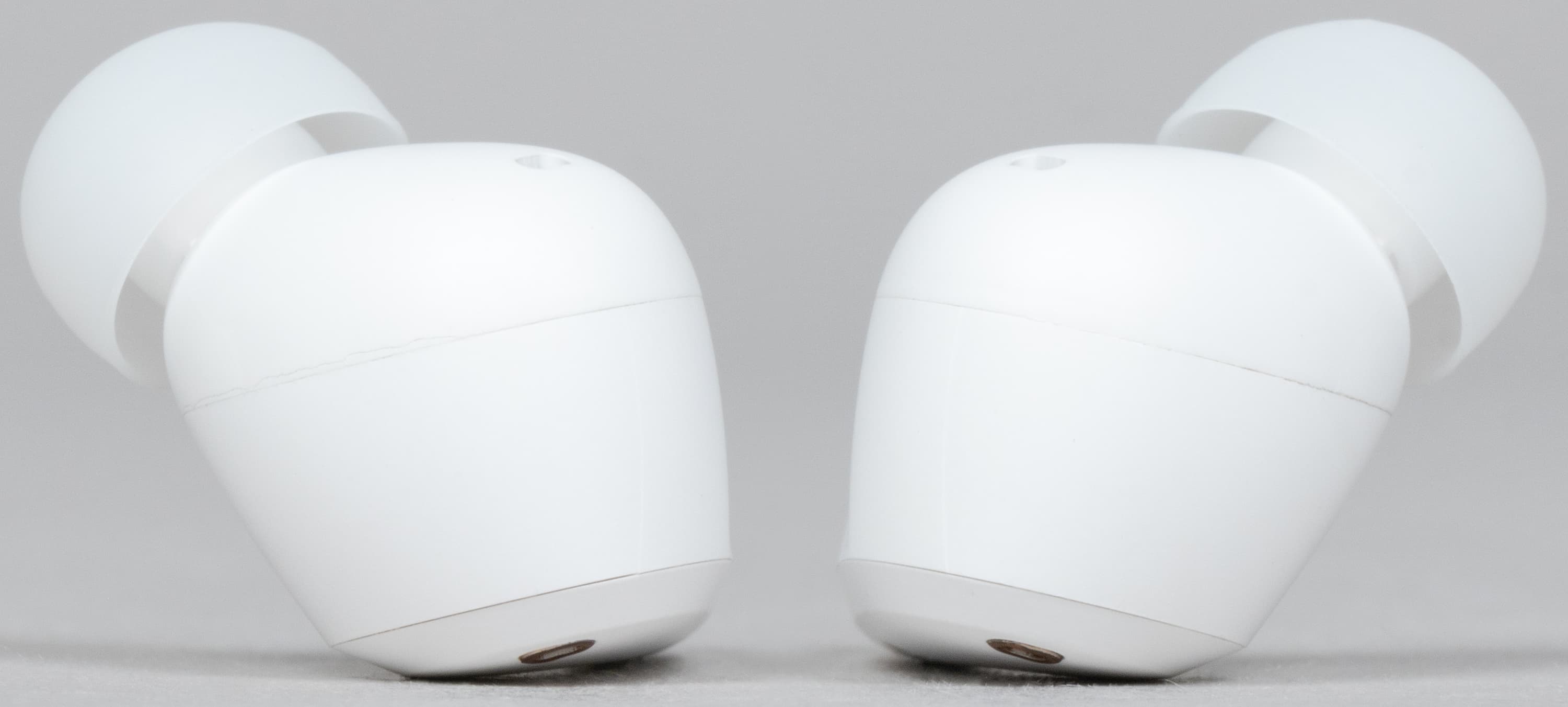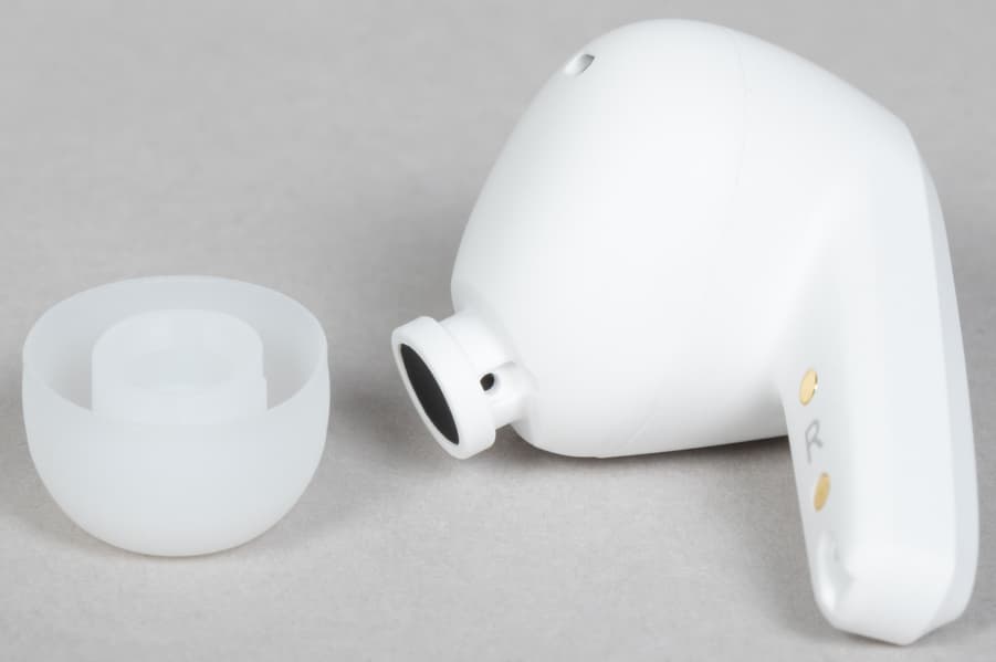 Силиконовые насадки более-менее надежно удерживаются крупным выступом на конце звуковода, при необходимости их легко снять и поставить на место. На боковой части звуковода видно компенсационное отверстие, служащее для сброса лишнего давления при работе динамика.