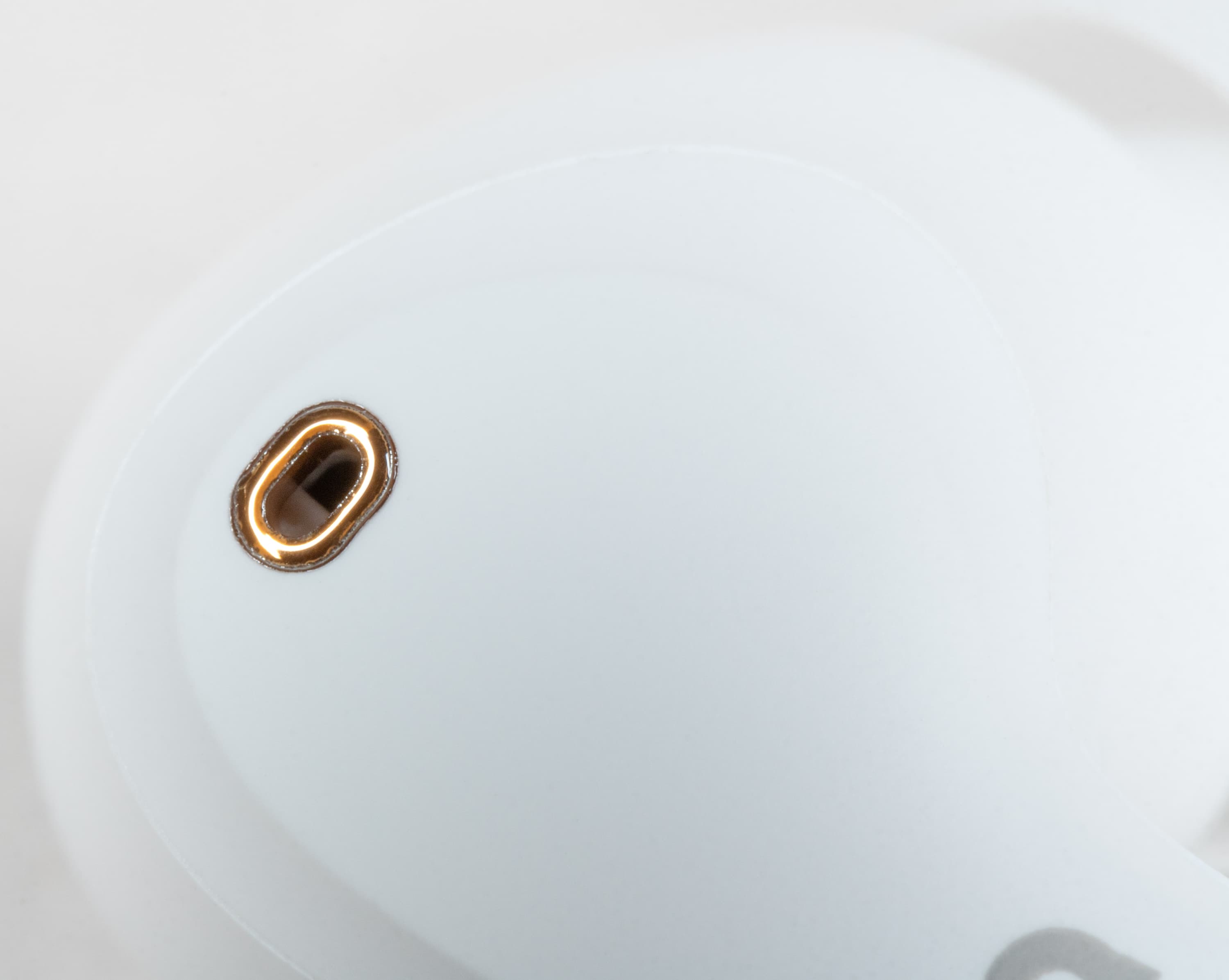 На внешних поверхностях размещены подчеркнутые золотистой окантовкой отверстия, за которыми скрываются микрофоны, обеспечивающие работу системы активного шумоподавления.