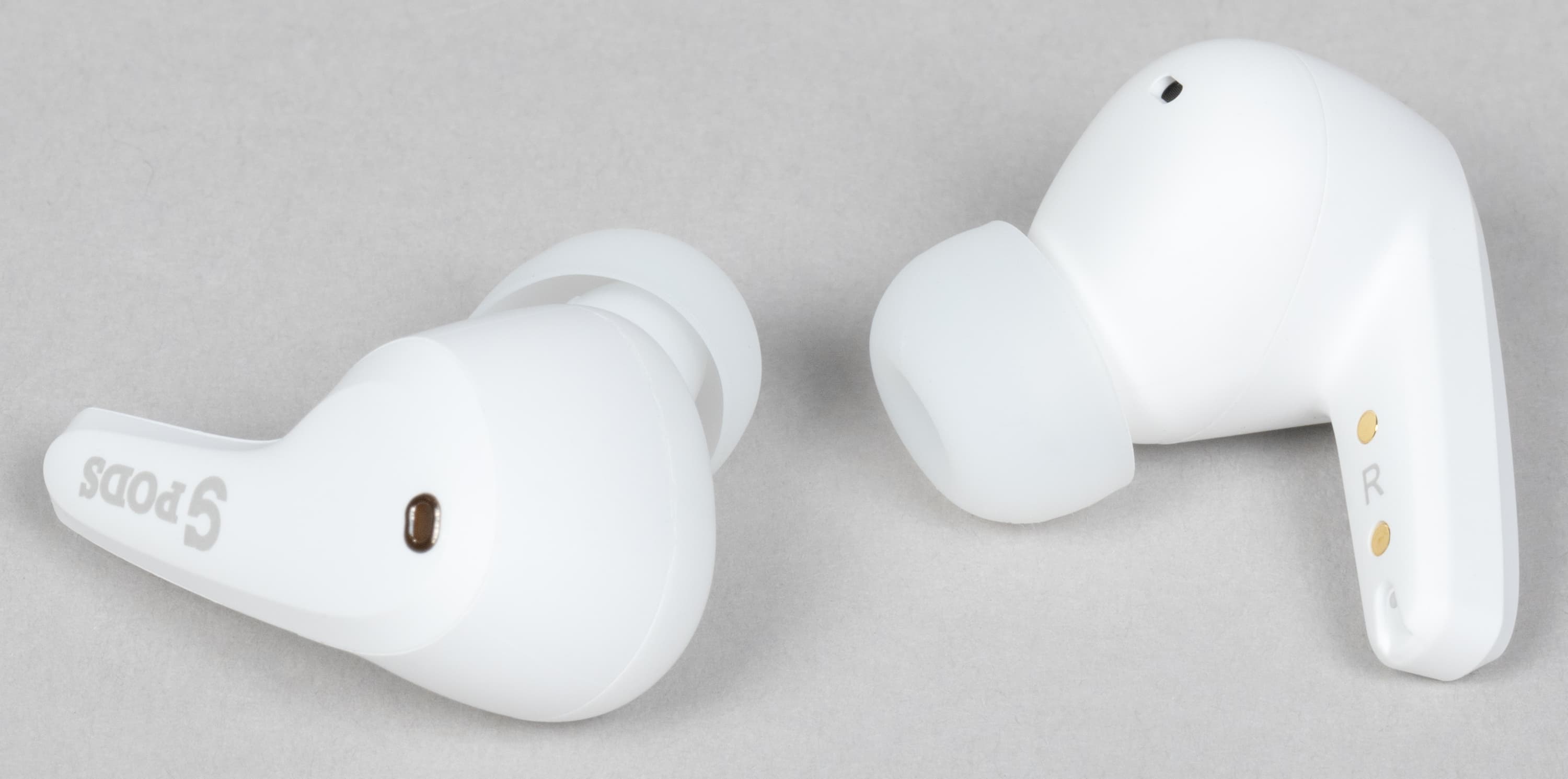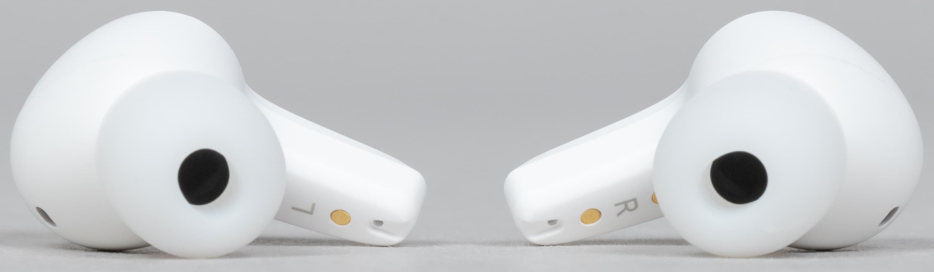 На внутреннюю часть «ножек» нанесены обозначения правого и левого наушников, там же мы видим контакты для зарядки.