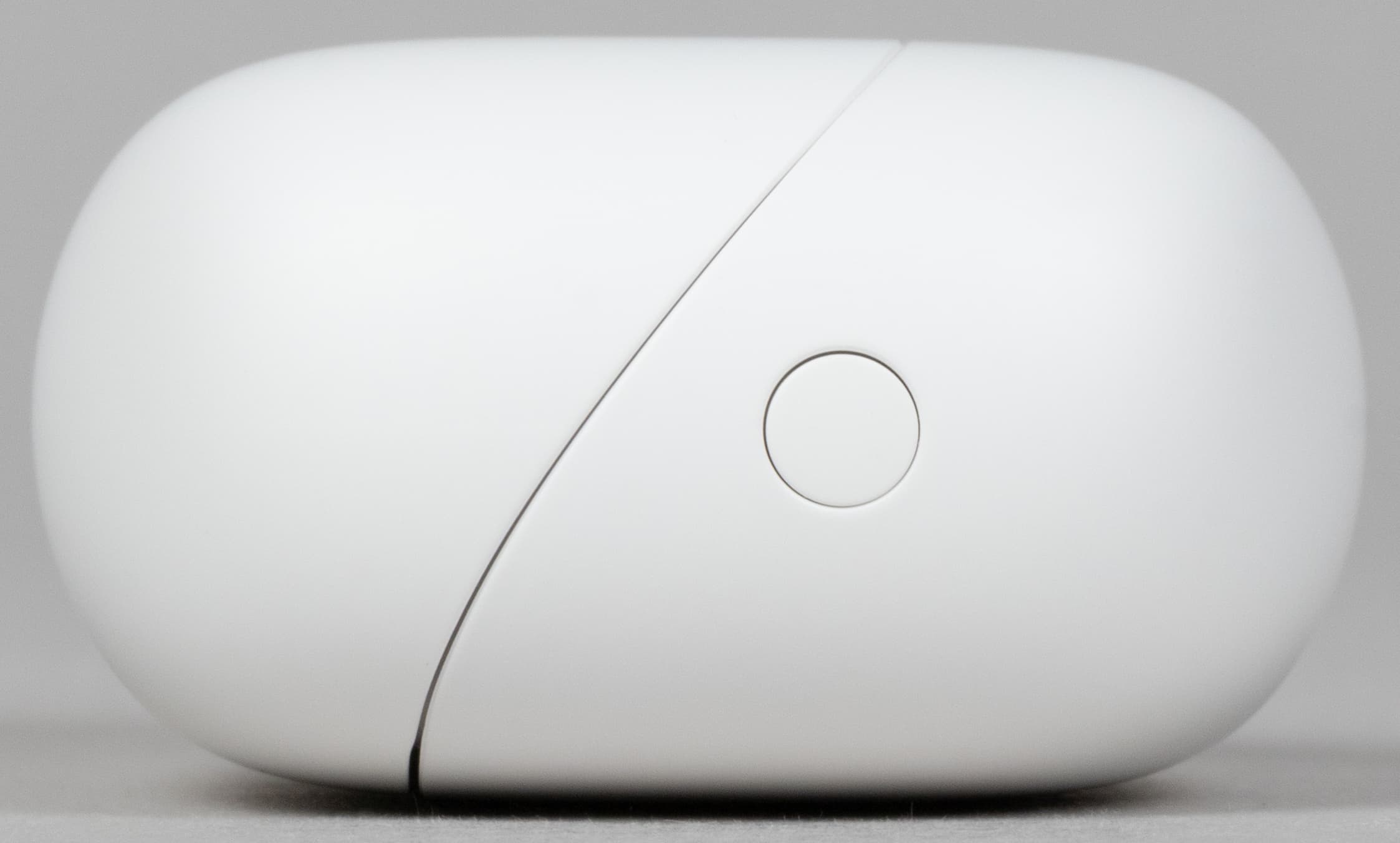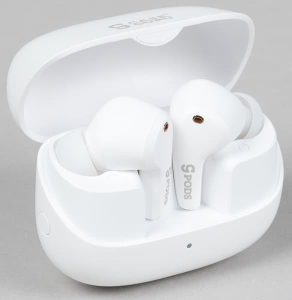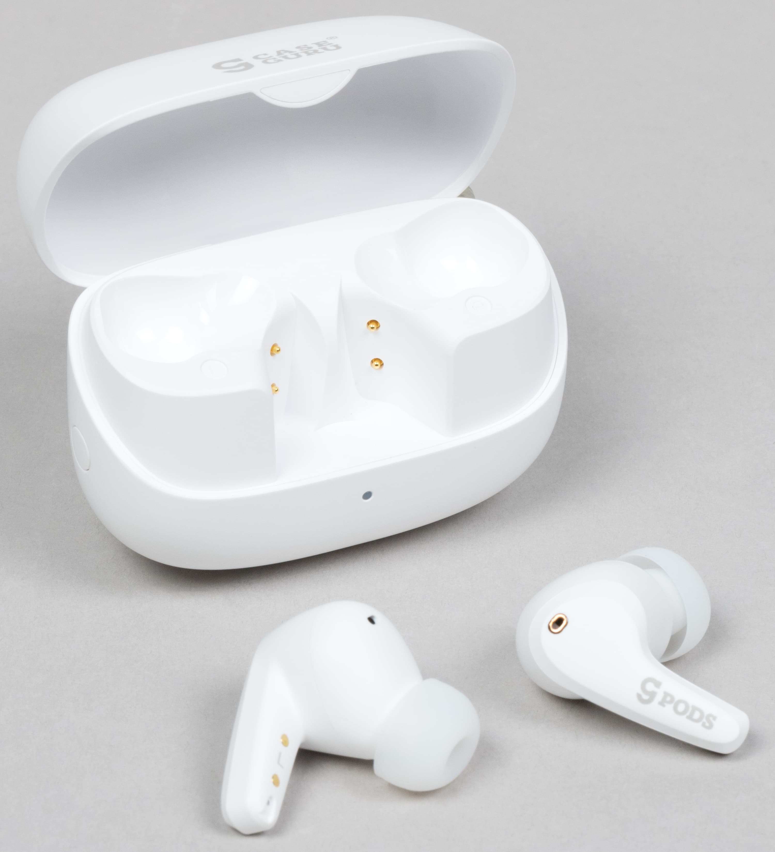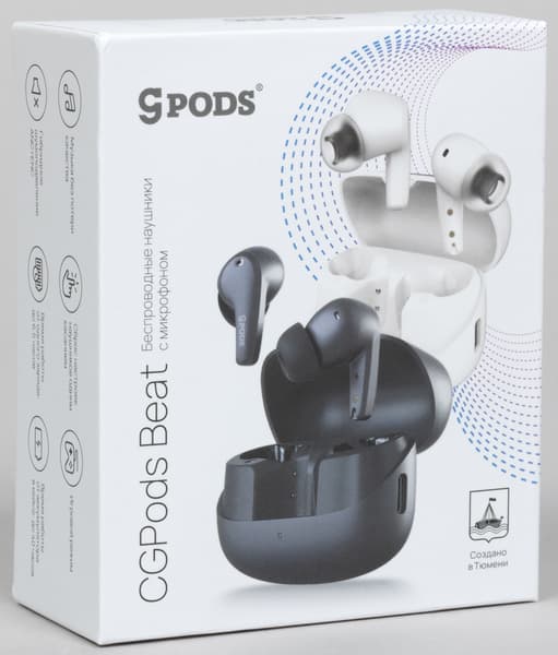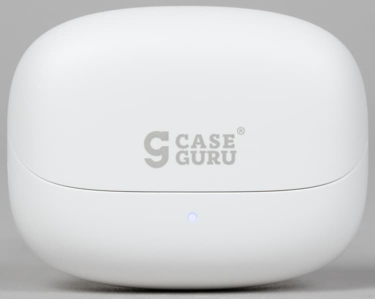CGPods Beat предлагаются в двух цветах: белом и темно-синем. Мы решили остановить свой выбор на более «классическом» и универсальном первом варианте. Кейс компактный, его размеры — 57×45×26 мм. Передняя и задняя поверхности плоские, благодаря чему он отлично помещается даже в небольшой карман брюк. На передней панели размещены крупный логотип производителя, плюс маленький светодиодный индикатор состояния устройства и зарядки.