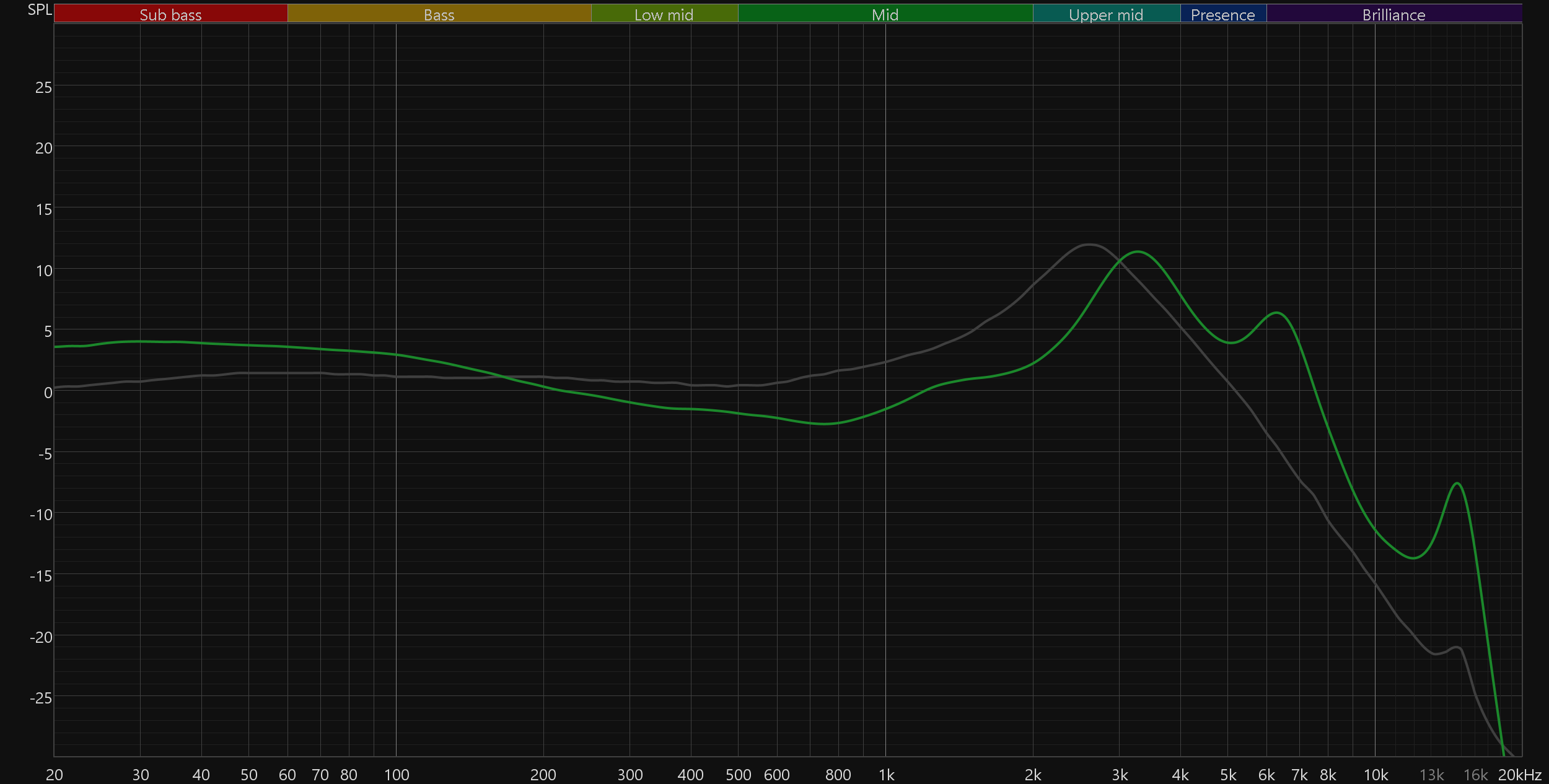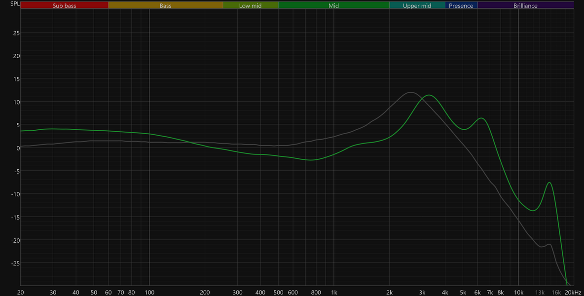 График АЧХ показан на фоне кривой IDF (IEM diffuse field compensation), предоставленной производителем используемого стенда. Ее задача — помочь скомпенсировать резонансные явления в имитированном слуховом канале и особенности оборудования, создав «звуковой профиль», максимально корректно иллюстрирующий то, как звучание наушников воспринимается слушателем. Ее можно рассматривать как адаптированный под конкретное устройство аналог так называемой «кривой Хармана», созданной командой Harman International под руководством доктора Шона Олива. Скомпенсируем полученный график АЧХ в соответствии с кривой IDF.