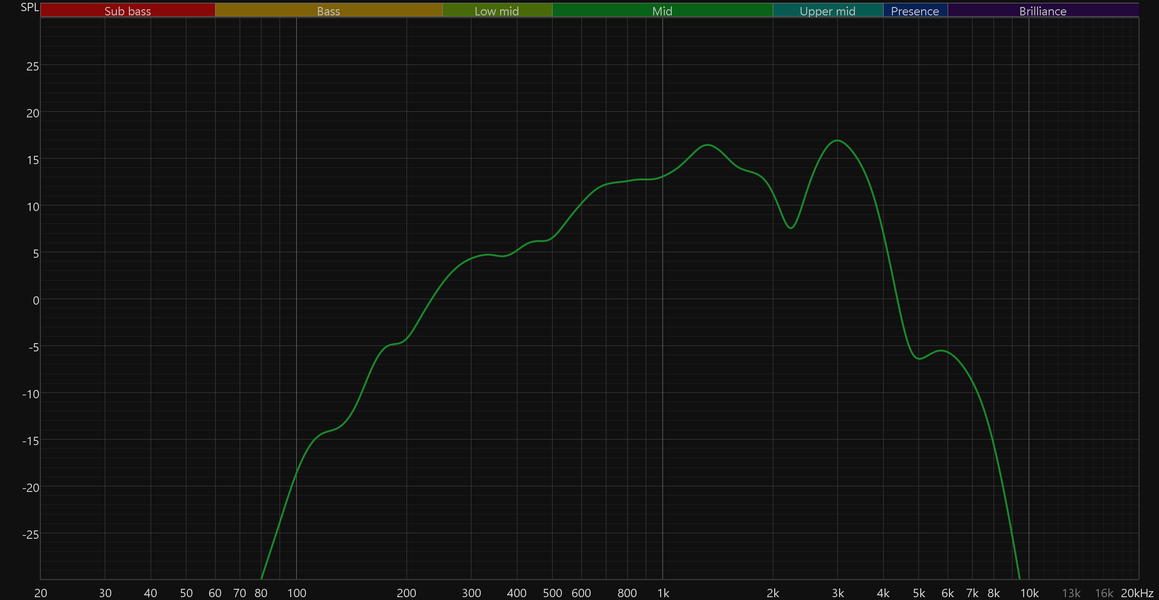 Посмотрим на работу микрофонов для голосовой связи CaseGuru CGPods Beat. Для измерения АЧХ микрофонов мы используем специально подготовленное помещение и мониторную акустическую систему, воспроизводящую свип-тон. Естественно, что АЧХ колонок далеко не равномерна, потому мы предварительно получаем ее график с помощью калиброванного измерительного микрофона. Далее полученные данные используются для построения корректирующего профиля, призванного скомпенсировать особенности акустики. После этого сигнал записывается с помощью героя тестирования, занимающего то же положение, что и измерительный микрофон ранее. Полученный график корректируется с помощью созданного предварительно профиля и на выходе у нас остается собственная АЧХ тестируемого микрофона.