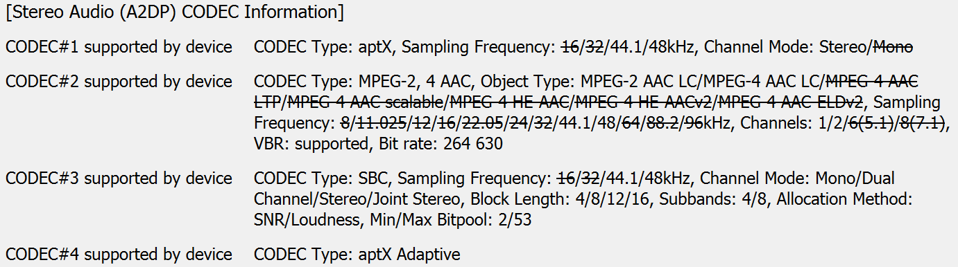 Все заявленные кодеки на месте: SBC, AAC, а также aptX Adaptive, на наличии которого производитель делает особый акцент в описаниях устройства. Максимум параметра Bitpool у кодека SBC выставлен на уровне 53, тогда как рекомендованный профиль High Quality подразумевает значение 51 — он будет работать на максимуме своих возможностей. Верхний порог битрейта AAC ограничен уровнем 264 Кбит/с, тогда как в большинстве устройств используется 256 Кбит/с. Также заявлена поддержка свежего кодека LC3, но определить его наличие используемая утилита не смогла.