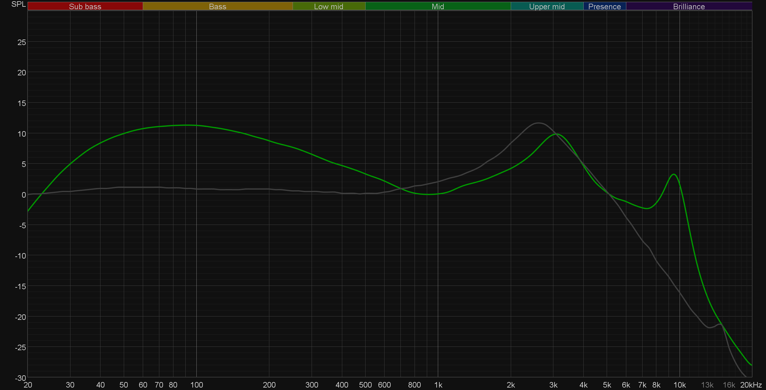 График выше показан на фоне кривой IDF (IEM diffuse field compensation), предоставленной производителем используемого стенда. Ее задача — помочь скомпенсировать резонансные явления в имитированном слуховом канале и особенности оборудования, создав «звуковой профиль», максимально корректно иллюстрирующий то, как звучание наушников воспринимается слушателем. Ее можно рассматривать как адаптированный под конкретное устройство аналог так называемой «кривой Хармана», созданной командой Harman International под руководством доктора Шона Олива. Скомпенсируем полученный график АЧХ в соответствии с кривой IDF.