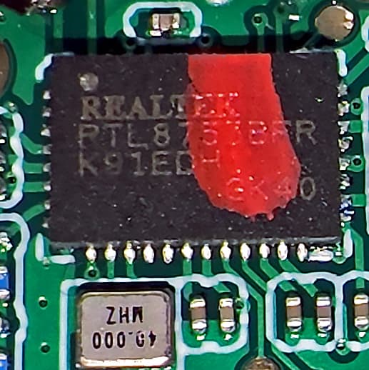 Рассказывая про прошлую версию, Вадим Боков делал особый акцент на том, что в ходе доработки прототипа «плохой китайский чип» был заменен на более «продвинутый» производства Realtek. В этот раз разработчики почему-то застеснялись использованного чипа и решили скрыть маркировку. Но сделали это как-то без особого усердия, мазок краски совершенно не помешал нам убедиться, что используется всё тот же Realtek RTL8753BFR.