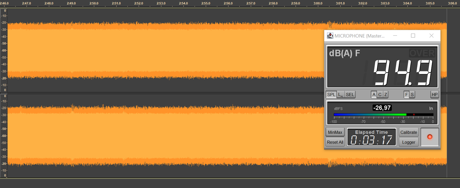 Вкратце напомним нашу методику тестирования автономности беспроводных наушников. Безопасным уровнем звукового давления при прослушивании музыки считается 75 дБ, но на практике большинство слушателей предпочитает уровень 90-100 дБ. Мы транслируем в наушники белый шум, фиксируя уровень SPL в районе 95 дБ, сразу после старта воспроизведения запускаем запись сигнала с измерительного стенда — по длине получившегося трека легко понять, сколько проработал каждый из наушников.